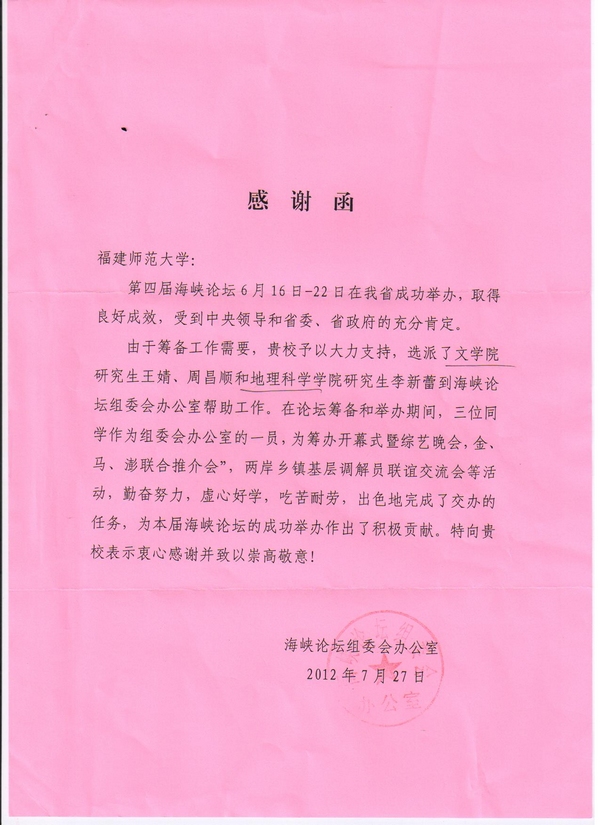 海峡论坛组委会致信感谢我校学生为第四届海峡论坛成功举办作出贡献
