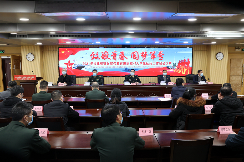 1月13日,由省征兵办、省委宣传部、省教育厅主办的2021年福建省征兵宣传教育进高校和大学生征兵工作启动仪式在省教育厅举行。省委常委、省征兵领导小组副组长、省军区司令员吴喜铧少将,省政府崔永辉副省长,省征兵领导小组副组长、省军区副司令员张玉生少将,省委宣传部陈辉宗副部长,省教育厅党组书记林和平厅长等军地领导出席。我校在旗山校区宏达厅设分会场,副校长涂荣,校征兵工作领导小组成员单位领导,以及今年春季意愿参军的大学生代表参加了会议。