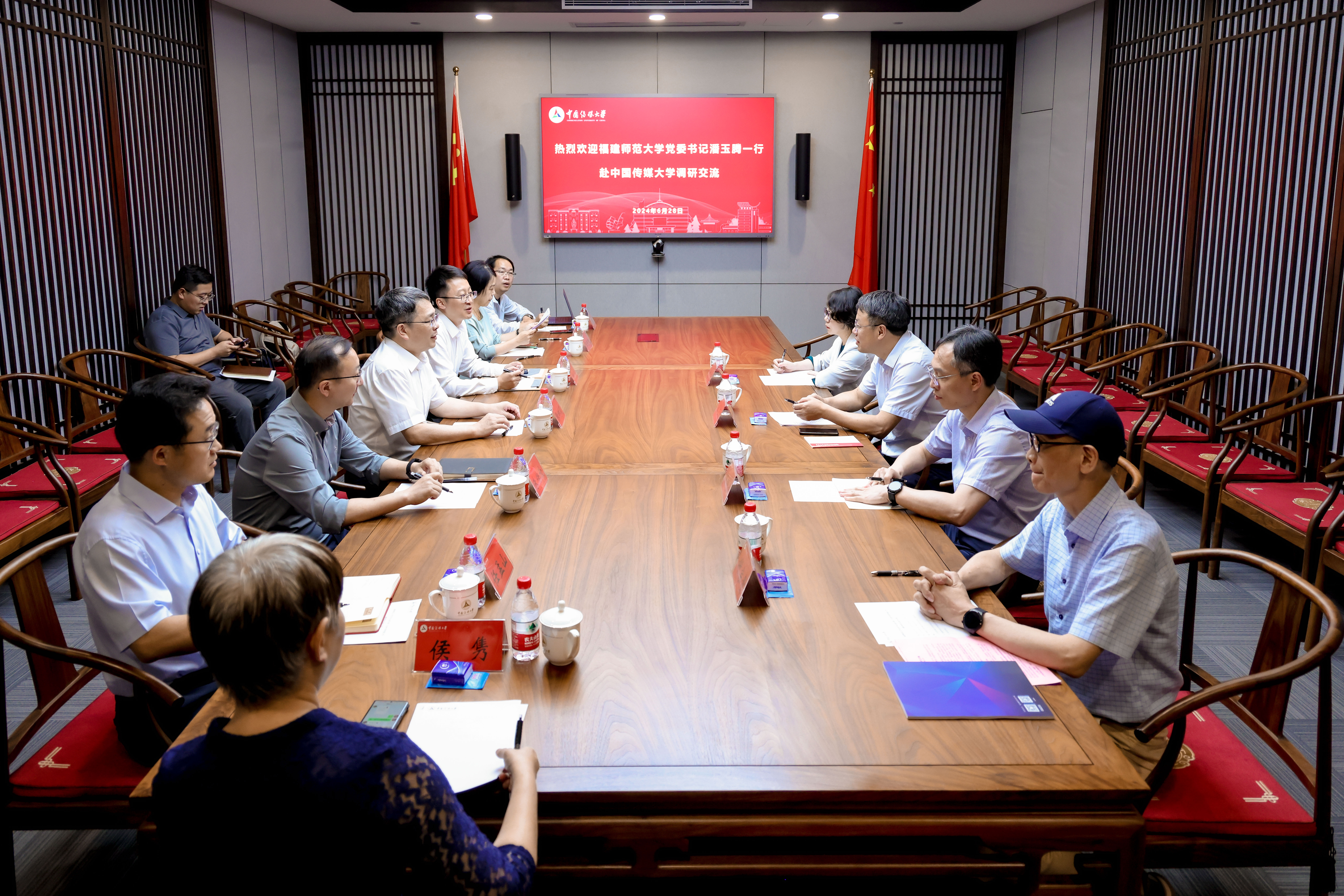 6月27日,校党委书记潘玉腾带领党政办公室、社会科学处、传播学院负责人到中国传媒大学调研交流。中国传媒大学党委副书记、校长张树庭,党委常委、副校长杨懿,党政办公室,本科生院,研究生院,星空体育网站赞助莱切处,媒体融合与传播国家重点实验室负责人参加调研座谈会。座谈会由杨懿主持。