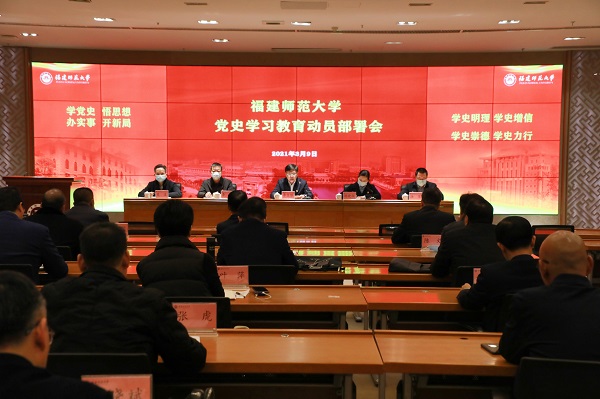 李宝银强调指出,在全党开展党史学习教育,是党中央作出的重大决策。全校上下要强化政治担当、扛起政治责任,认真对照中央精神、省委要求和省委教育工委部署,紧密结合学校实际,扎实开展党史学习教育。一要突出“三个坚持”,高站位把握党史学习教育的重大意义。坚持提高站位,迅速把思想和行动统一到习近平总书记重要讲话精神和党中央决策部署上来,增强开展党史学习教育的思想自觉、政治自觉和行动自觉;坚持立足实际,紧紧围绕党情、国情、省情、教情、校情,认真学好党史“必修课”,激发干事创业强大动能,切实做到学史明理、学史增信、学史崇德、学史力行;坚持守正创新,增强机遇意识和奋斗精神,抓住用好“战略机遇期”,全力跑出“发展加速度”,奋力实现高质量进位赶超。二要突出“四个聚焦”,高质量完成党史学习教育的各项任务。聚焦学史明理,把学习党史与重温校史结合起来,通过学校在党的领导下办学兴学、育人育才、创新创业的历史考察,总结历史经验、把握历史规律,增强工作的系统性、预见性、创造性,蓄积起“重整行装再出发”的磅礴力量;聚焦学史增信,坚持不懈用党的创新理论最新成果武装头脑、指导实践、推动工作,把学习党史和落实立德树人根本任务结合起来,着力培育时代新人,坚定实现中华民族伟大复兴中国梦、把中国特色社会主义更加有力地推向前进的信心决心;聚焦学史崇德,继承弘扬党的光荣传统和优良作风,认真践行全心全意为人民服务的宗旨,牢固树立“师生所望就是工作所向”的理念,扎实开展“我为群众办实事”实践活动,推动改革红利和发展成果最大限度惠及师生;聚焦学史力行,结合“再学习、再调研、再落实”活动,把学校的各项工作放在国家发展全局、福建发展布局和高等教育格局中来审视分析,着力改革创新,强化攻坚克难,汇聚发展合力,奋力开创学校事业高质量发展新局面。三要突出“五个加强”,高标准落实党史学习教育的具体要求。加强政治引领,树立正确党史观,准确把握党的历史发展的主题主线、主流本质,充分发挥学校作为“南方坚持马克思主义的重要阵地”作用,加强思想引导和理论辨析,旗帜鲜明反对历史虚无主义;加强组织领导,及时成立党史学习教育领导机构和工作机构,认真制定方案,广泛宣传发动,精心组织实施,确保学习教育取得实实在在的成效;加强工作创新,坚持因地制宜、加强分类指导、丰富载体内容,构建三级党组织“学习圈层”,激发广大师生“迈进新征程、奋进新时代”的精气神;加强宣传宣讲,充分发挥优势,开展研究阐释,力争推出一批创新性理论研究成果,充分挖掘学校发展史中的红色基因,引导广大师生爱党爱校;加强示范带动,充分发挥“关键少数”作用,推动党员领导干部在学党史、讲党史、懂党史、用党史上先学一步、学深一层,带动本单位、分管领域的学习教育有序开展、持续开展。