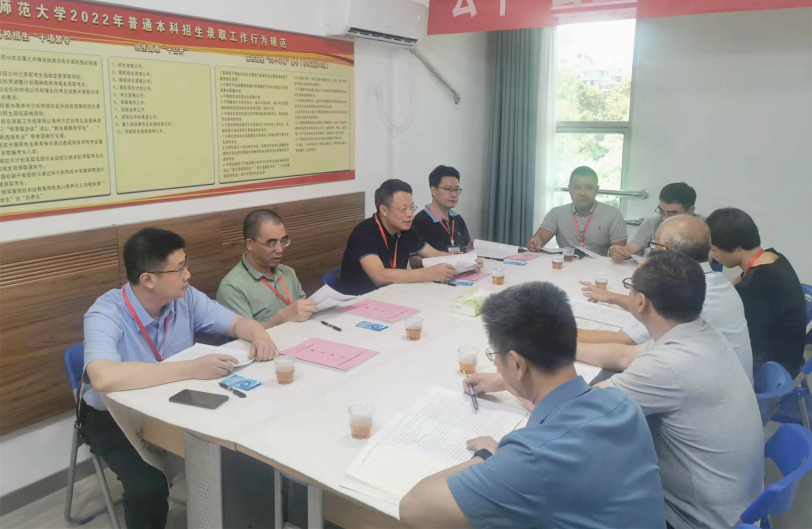 潘玉腾指出,本科生源质量决定学校人才培养质量,本科招生工作是学校人才培养的重要关口,要在强化内涵建设基础上,不断提高学科和专业建设水平,吸引更多优质生源选择我校。他强调,要继续积极拓宽招生宣传渠道,充分展示学校学科建设、人才培养、科研创新、校园文化和社会服务等方面新成效,着力提升考生、家长和社会对学校的认可度;要继续严格落实阳光招录工作规范,严格按照招生工作纪律要求和政策规定,严格执行学校招生章程,按章办事,依规录取,确保录取工作全过程“零差错”“零失误”,确保公开、公平、公正;要继续扎实做好录取后续考生咨询服务工作,持续优化线上线下咨询和答疑解惑,以寄送录取通知书为纽带,及时传递百年师大的人文情怀和殷切期望,有效提升百年学府美誉度;要继续全力做好服务保障,各职能工作组要统筹协调,各司其职,密切配合,健全完善技术、水电、食宿、疫情防控等条件保障,尤其要注意防暑降温,确保今年学校本科招生录取工作平稳、安全、有序。