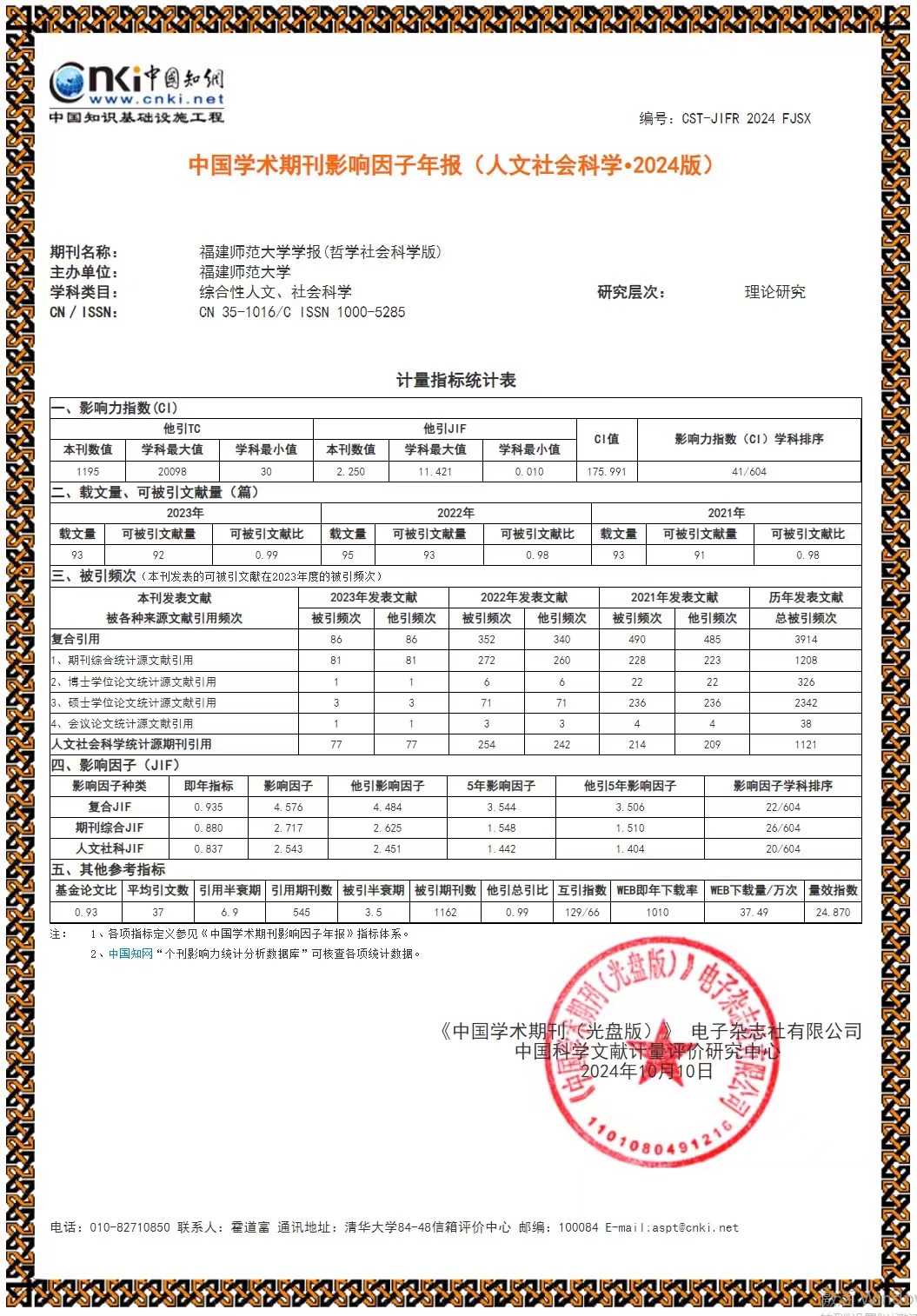 日前,《中国学术期刊(光盘版)》电子杂志社有限公司、中国科学文献计量评价研究中心联合发布《中国学术期刊影响因子年报(人文社会科学·2024版)》。《星空下载游戏推荐安卓学报(哲学社会科学版)》影响力指数CI值为175.991,在综合性人文社会科学604种期刊中排名第41位,相比上一年度又前进7个位次;复合影响因子为4.576,综合影响因子为2.717,均比上一年度有所提升。(学报编辑部)