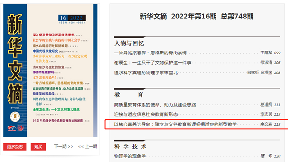 日前,我校教育学院教师、教育部基础教育课程研究中心主任余文森教授发表在《中国教育学刊》2022年第5期的学术论文《以核心素养为导向:建立与义务教育新课标相适应的新型教学》,由《新华文摘》2022年第16期全文转载。