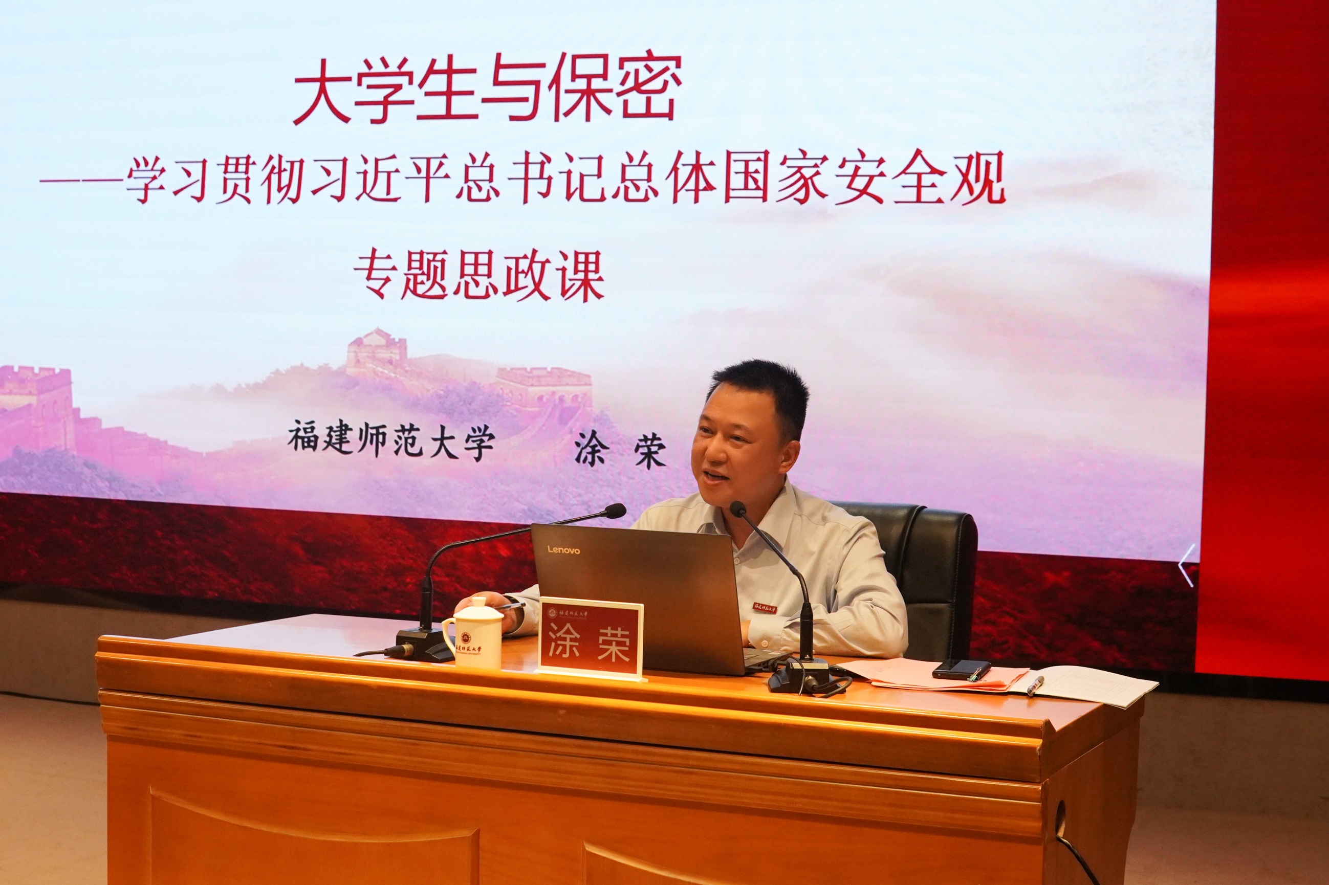 开班式后,涂荣以“大学生与保密”为题作了专题讲座。他以典型案例为切入点,将现场模型展示与图文并茂讲解相结合,系统阐述了坚持总体国家安全观的具体要求,希望青年学生进一步增强保密意识、维护国家安全。