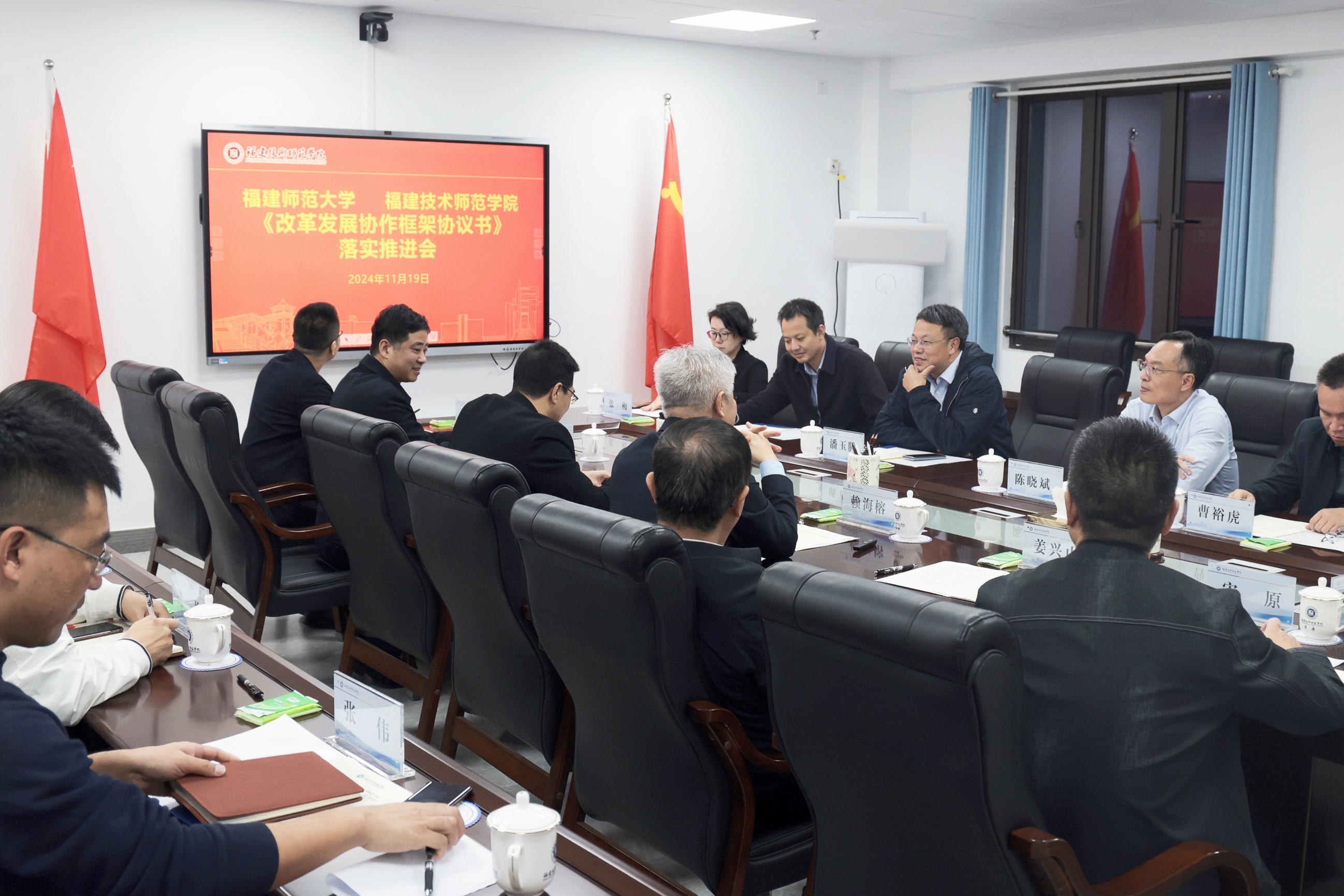 在福建技术师范学院,潘玉腾一行深入了解了该校新校区建设的基本情况,并召开我校与福建技术师范学院《改革发展协作框架协议书》落实推进会。福建技术师范学院党委书记赖海榕、校长吴克寿、副校长姜兴山参加会议。会上,潘玉腾表示,将进一步统筹资源整合,支持福建技术师范学院加快推进内涵式高质量发展,希望两校以建立改革发展协作关系为契机,加强两校工作统筹和对口联系,携手打造福建高校协作典范,扎实推动校际合作取得丰硕成果,共同为新福建建设贡献智慧力量。赖海榕对我校长期以来给予福建技术师范学院的关心和支持表示感谢,并介绍了学校发展现状和未来规划,他希望两校进一步深化交流交往,推动合作继续走深走实。吴克寿希望我校在学位点建设、师资队伍、人才培养等方面给予福建技术师范学院更多支持,助力学校事业高质量发展。两校相关部门负责同志也在会上进行了对口交流。