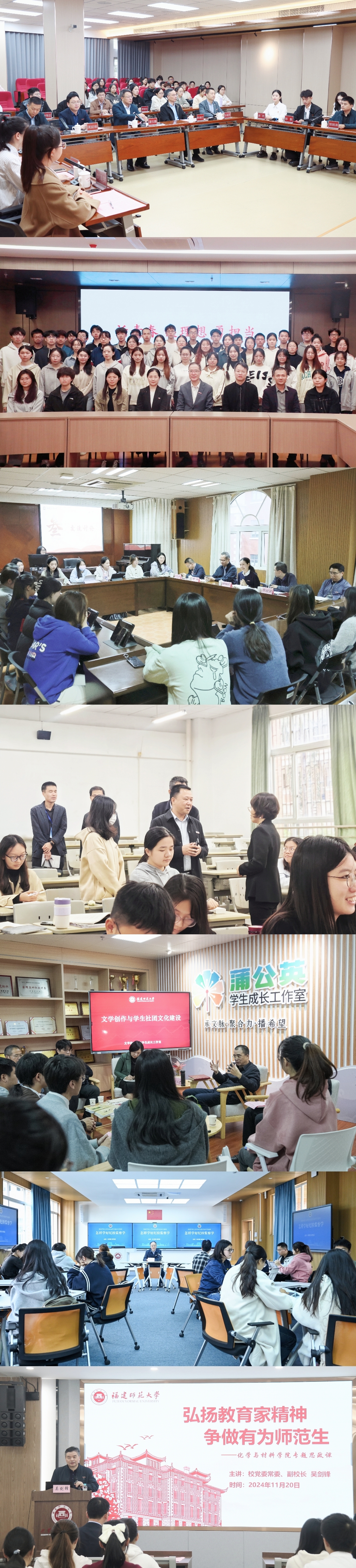 校党委书记潘玉腾走进马克思主义学院2023级思想政治教育专业二班和福建省习近平新时代中国特色社会主义思想大学生研习社(星空下载游戏推荐安卓),开展“凝心聚力担使命 知行合一强根基”主题座谈会;校长王长平参加数学与统计学院2023级数学实验班“话青春 谈理想 勇担当”主题班会,并为学生上思政课;校党委副书记陈晓红参加音乐学院2022级音乐学(国家人才培养基地)班“温暖·安全·成长”主题班会;校党委副书记涂荣深入经济学院2021级经济学(国家人才培养基地)班看望毕业班同学并随堂听课;副校长郑家建与文学院2022级汉语言文学(师范)五班及文学社师生代表开展“文学创作与师范生素质提升”主题座谈会;校纪委书记林月恩为法学院、纪检监察学院2022级纪检监察实验班同学们讲授“怎样学好纪检监察学”专题思政课;副校长吴剑锋为化学与材料学院2023级化学(师范)班学生讲授“弘扬教育家精神,争做有为师范生”专题思政课。