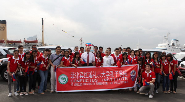 4月13日,应菲律宾海军邀请,圆满完成亚丁湾海域护航任务的我国海军525护航编队抵达马尼拉南港,对菲律宾进行为期5天的友好访问。这是我国海军护航编队首次访问菲律宾。我校与菲律宾红奚礼示大学合作创建的红奚礼示大学孔子学院师生作为我国教师代表和菲律宾大学生代表,与菲律宾海军官兵、我国驻菲律宾大使馆工作人员等一同前往南港迎接。