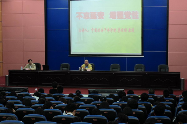 4月24日下午,中国延安干部学院李世明教授在旗山校区图书馆学术大讲堂为我校学生党员、入党积极分子作了题为《不忘延安 增强党性》的报告。报告会由校党委副书记黄锦平主持。学校办公室、组织部、宣传部负责同志参加了报告会。
