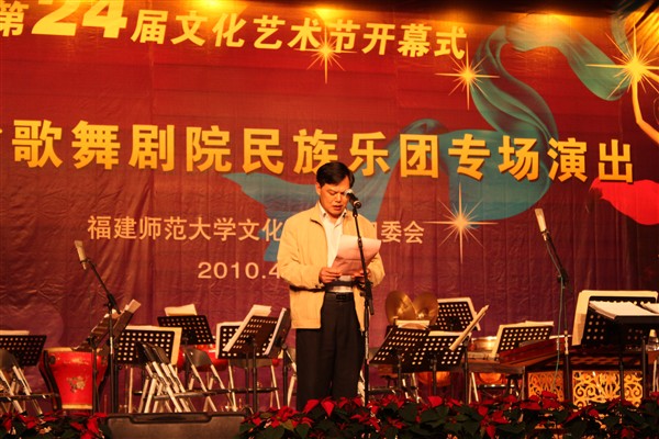 校党委副书记黄锦平致开幕词。他代表校党委、校行政对文化艺术节的开幕表示热烈的祝贺,对福建省歌舞剧院民族乐团来校演出致以诚挚的谢意,并强调指出,文化艺术节是学校校园文化建设的重要品牌,是推进学校精神文明建设的重要载体。希望全校各单位精心组织、周密安排,将本届文化艺术节办得生机勃勃、富有成效,推动我校文化建设工程再上新台阶。