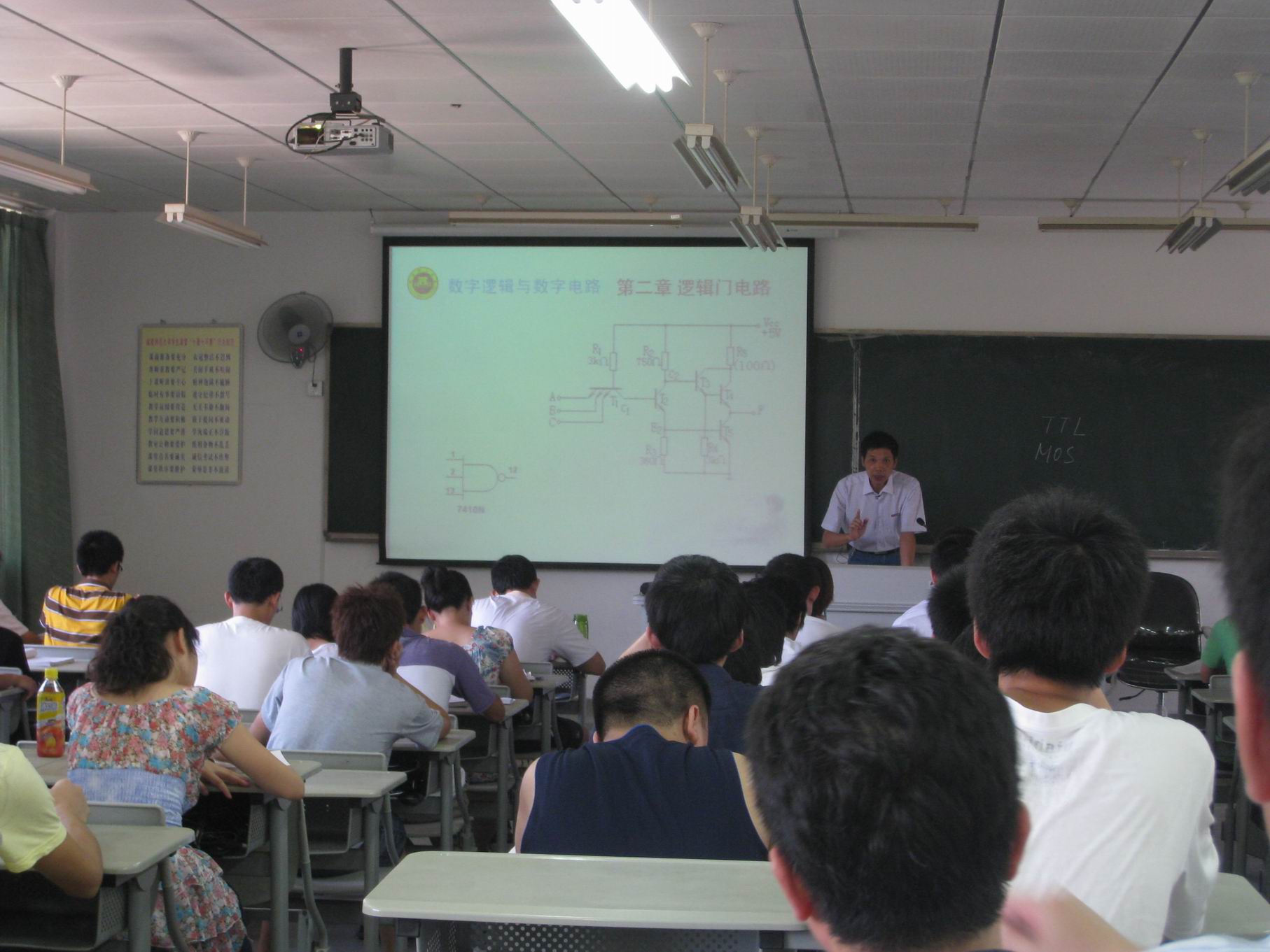 课堂上,蔡声镇教授首先引导学生对上一章内容进行总结,并熟练地应用PPT技术,用与课程内容密切相关又能激发学生学习兴趣的图片及注释,巧妙地引导学生进入本节课程内容——逻辑门电路基础。接下来,他采用形象的示意图和能够与教学内容同步展示的流程图,展示了半导体主要特性及其在日常生活中的应用,分析了本征半导体和杂质半导体的微观结构与宏观特性,在此基础上,对“PN结”的形成过程和“PN结”导电机理作了详细的分析与总结,较好地解决了“‘PN结’的微观结构决定其宏观特性”的教学难点,取得了较好的课堂教学效果。