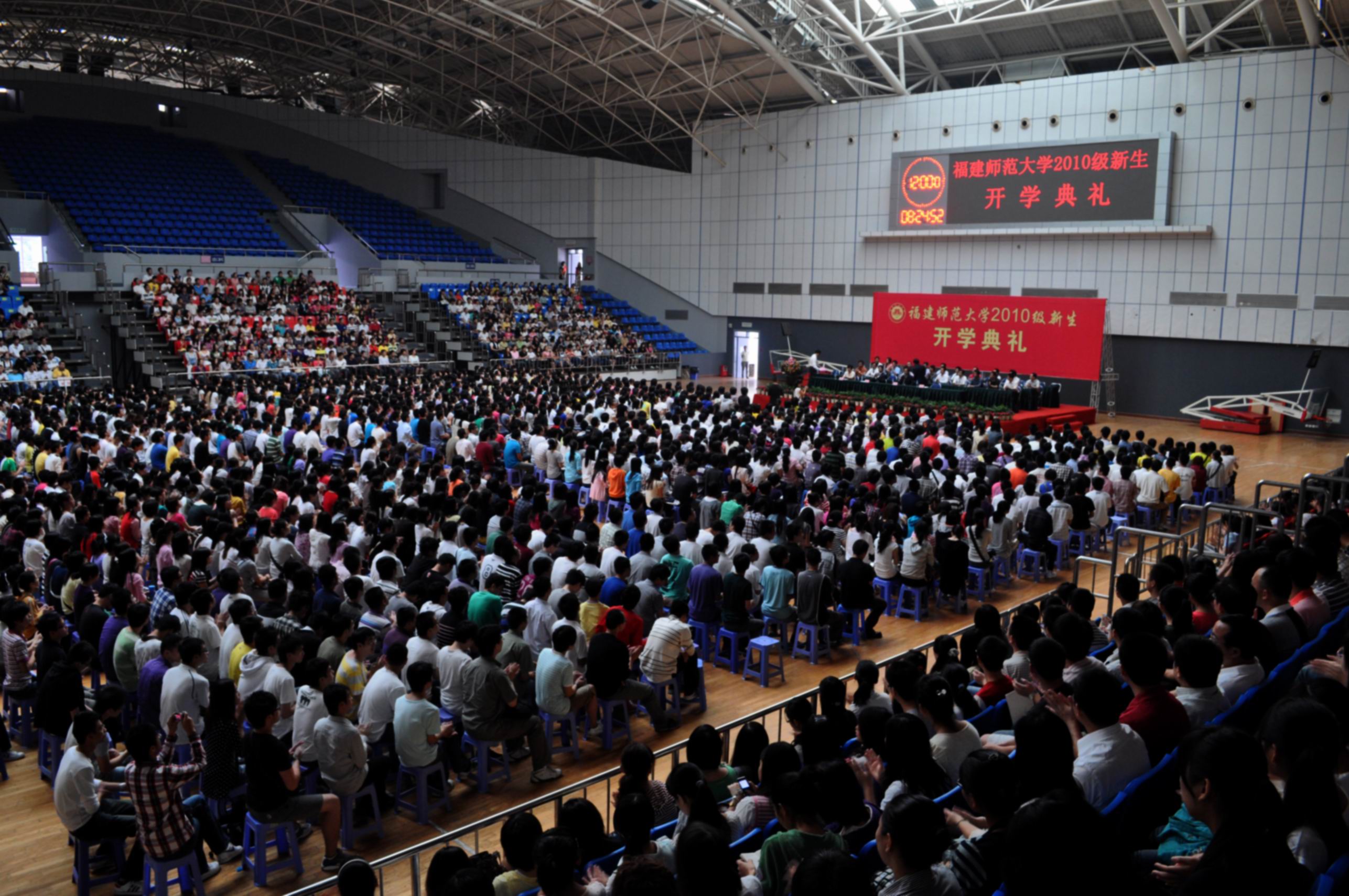 黄汉升校长发表了热情洋溢的讲话。他首先代表全体师生员工,对新同学加入福建师大这个大家庭表示热烈的欢迎。在简要介绍学校基本情况和特点后,黄校长送给2010级新生三句话。第一句话是诚以立德,信而致远,做一个品德高尚的人。希望同学们不仅要注重知识养料的汲取,而且要重视锤炼自己的品格,不断加强自身修养,培养自己乐观向上的品格、豁达包容的精神和诚信负责的作风。第二句话是志存高远,脚踏实地,做一个理想远大的人。希望同学们树立远大的志向,志存高远,胸怀天下。在仰望星空中,保持着谋划和引领社会发展的冲动、激情和追求;在脚踏实地中,刻苦学习,掌握引领未来的本领。第三句话是敏于求知,学以成业,做一个追求卓越的人。希望同学们用自己坚实的脚步,践行“知明行笃”的校训。既要“读万卷书”,又要“行万里路”,做到“知行合一”,在实践中加深对知识的理解,在实践中完成对理论的升华。