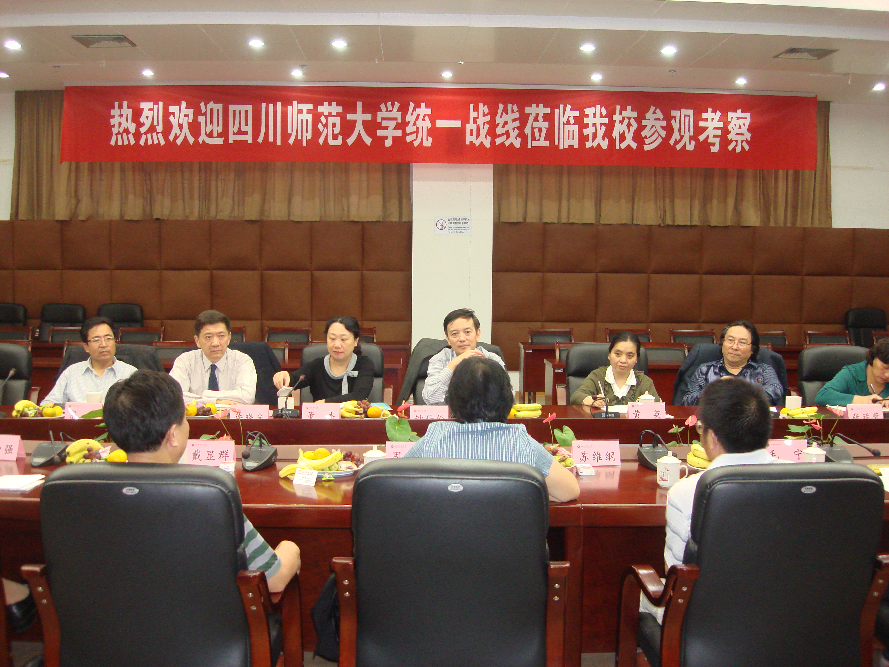 罗萤书记代表校党委、校行政对远道而来的客人表示热烈欢迎,对第五届全国高等师范院校田径运动会在四川师范大学的成功举办表示热烈祝贺。他向客人介绍了我校的基本情况、发展思路和目前正在开展的工作,希望两校进一步加强联系和交流,为我国的教师教育作出新的更大贡献。党委统战部负责人向考察团介绍了我校统战工作情况,校统一战线有关组织负责人与考察团成员进行了对口交流。