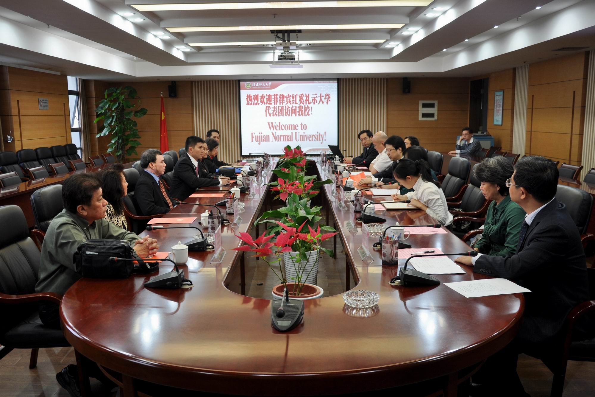 10月20日,校领导黄汉升、李敏、许明在旗山校区第二会议室亲切会见了来宾。黄汉升校长对代表团的首次来访表示热烈欢迎,并简要介绍了我校的办学历史、办学现状和学科特色。安杰利斯校长表达了对我校由衷的敬意和谢意,在简要介绍菲律宾红奚礼示大学后,他着重介绍了与我校共建的孔子学院在过去十个月中开展项目的情况,感谢我校对孔子学院工作的大力支持。见面会上,双方就学科交流、教师培训、学生互派等方面的合作进行了商讨,希望两校能开展全方位、多层次的合作。