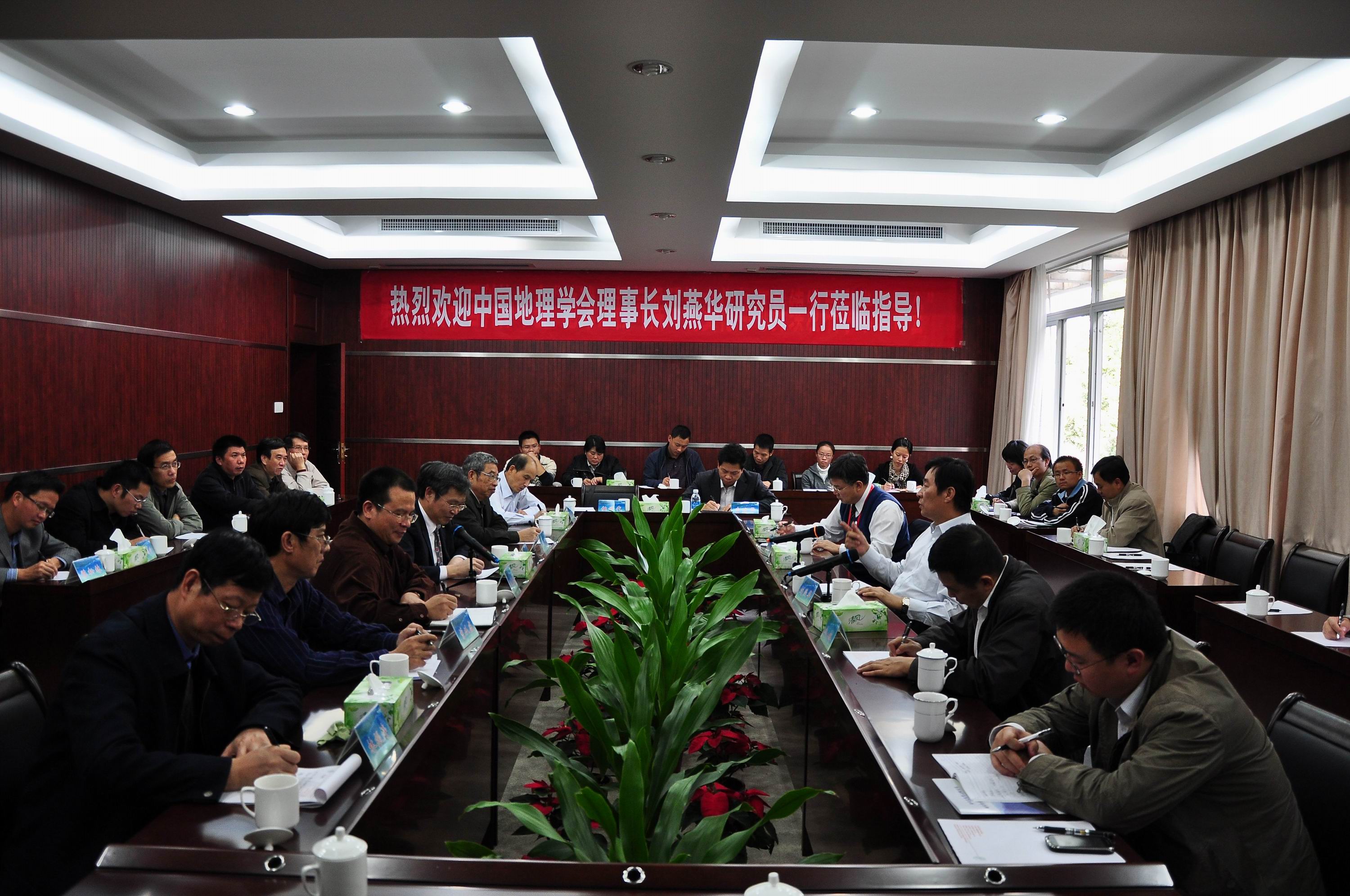 刘燕华一行考察了地理科学学院的学科建设、团队建设和国家重点实验室培育基地的功能实验室,并与学院的部分教师座谈。座谈会上,汪文顶对刘燕华一行来我校指导工作表示热烈欢迎,学院负责人汇报了学院概况、近年来取得的成绩和国家重点实验室培育基地的研究方向与建设措施。