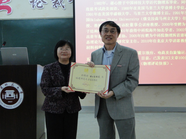11月12日,我校举行客座教授聘任仪式,敦聘美国Oklahoma State University(俄克拉荷马州立大学)校董事会讲座教授、北京大学“千人计划”引进人才、北京大学量子材料中心主任、科技部重大星空体育网站赞助莱切计划项目(973计划)首席科学家谢心澄为客座教授。李敏副校长向谢心澄教授颁发了聘书,并为他佩戴星空下载游戏推荐安卓校徽。
