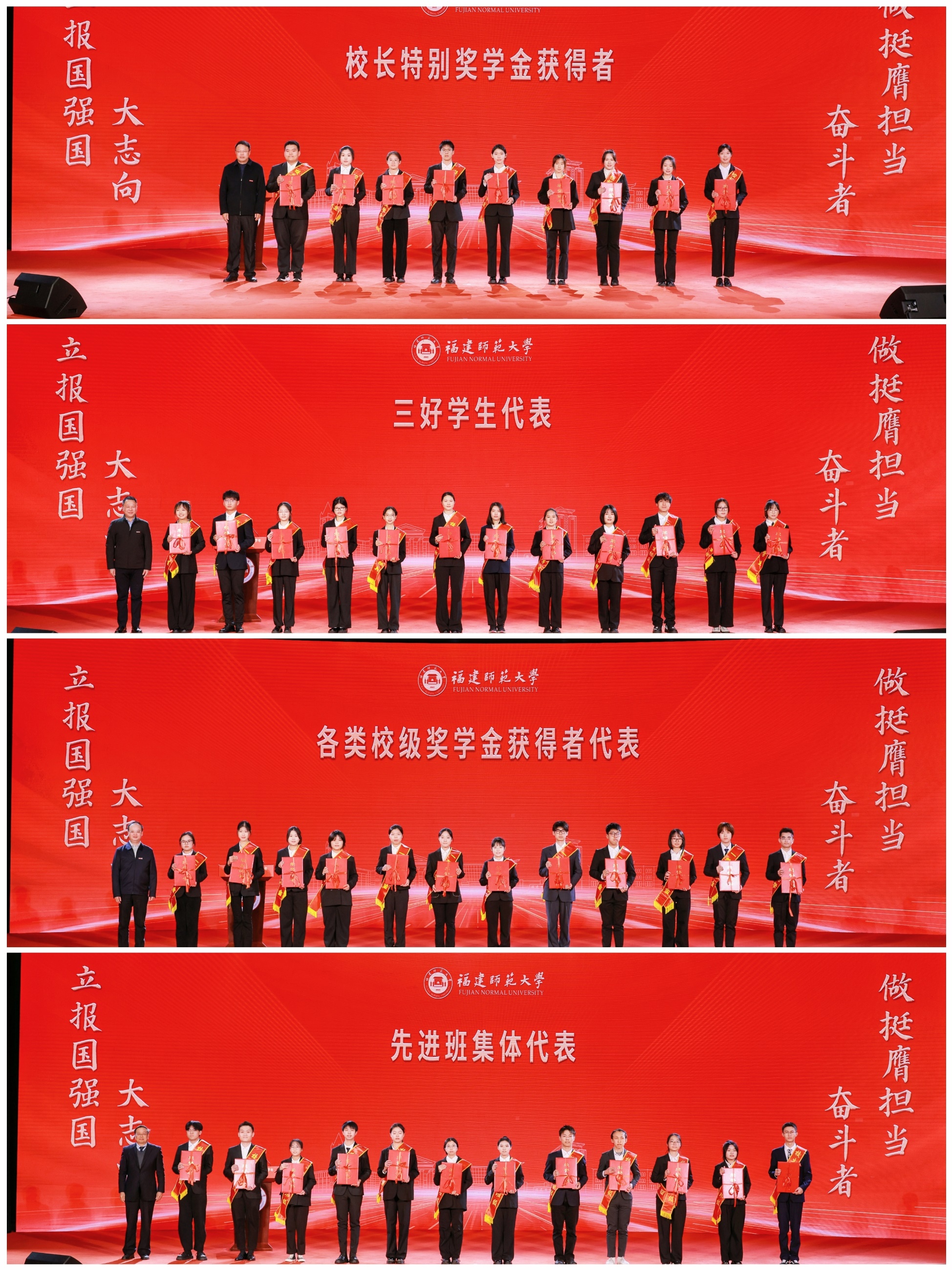 大会表彰了学校2023-2024学年各级各类先进集体和先进个人,包括345位国家奖学金获得者、627位国家励志奖学金、9位校长特别奖学金、233位博士研究生宝琛创新奖学金、3516位校研究生学业奖学金、6213位校优秀学生奖学金获得者;35位校学生党员标兵、36位校学生党务工作标兵、81位校三好学生标兵、1581位校三好学生、1715位校优秀学生干部;76个校先进班集体、236个免监考班级、38个“大学生自主学习马克思主义理论”先进集体、15个优秀学院易班工作站;101位“大学生自主学习马克思主义理论”先进个人、26位校优秀易班学生干部。