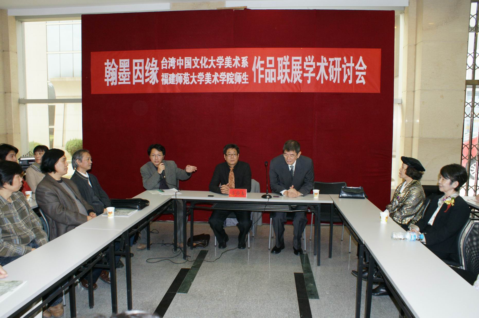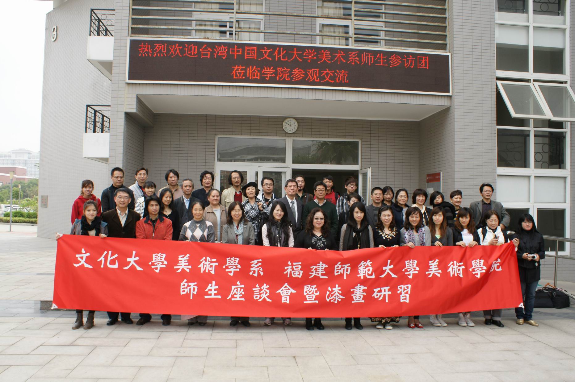 台湾中国文化大学是台湾享有盛誉的著名大学,与大陆有着深厚的历史渊源,在弘扬中华传统文化和促进两岸文化交流方面具有良好的历史传统。近年来,台湾中国文化大学与我校往来密切,师生互访频繁,本次展览即是两校交流互动的又一次积极尝试。双方拟于明年3月在台北举办两校师生美术作品联展。届时,我校亦将组团访问台湾中国文化大学并开展进一步的学术探讨和艺术交流。