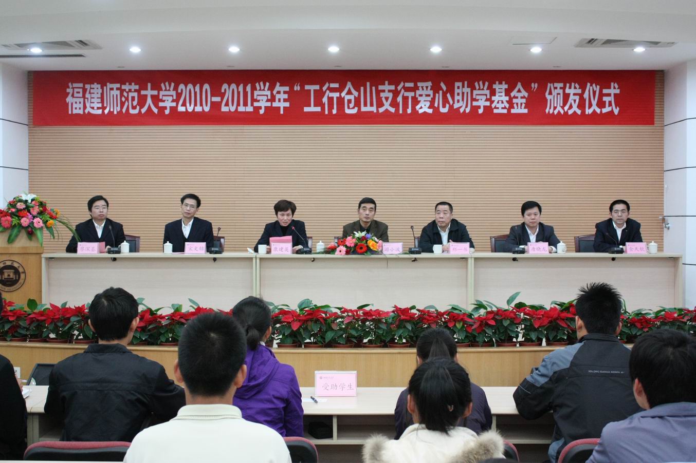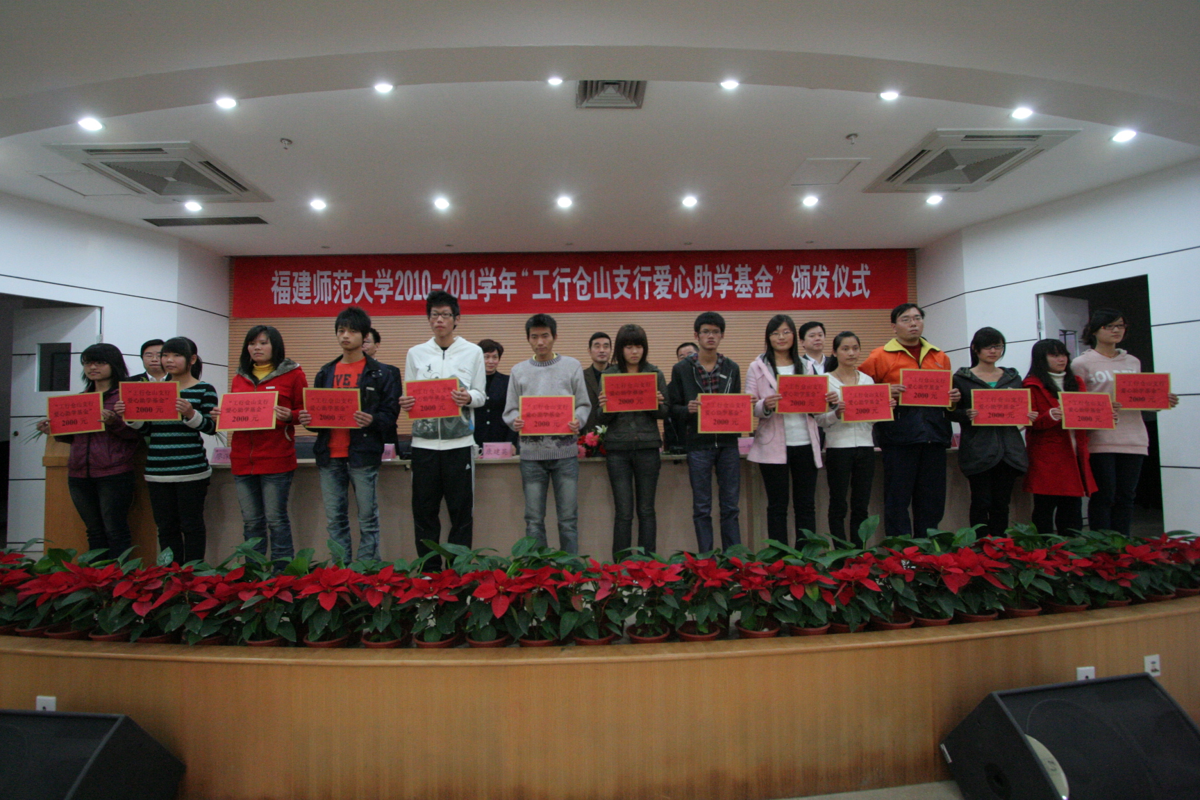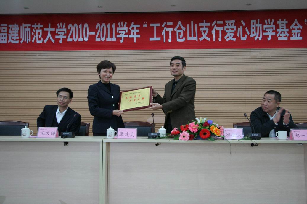 “工行仓山支行爱心助学基金”由中国工商银行福州市仓山支行发动员工捐资设立,每年10万元,用于资助我校品学兼优的50名家庭经济困难学生完成大学学业。此次颁发仪式是“工行仓山支行爱心助学基金”的首次颁发仪式。