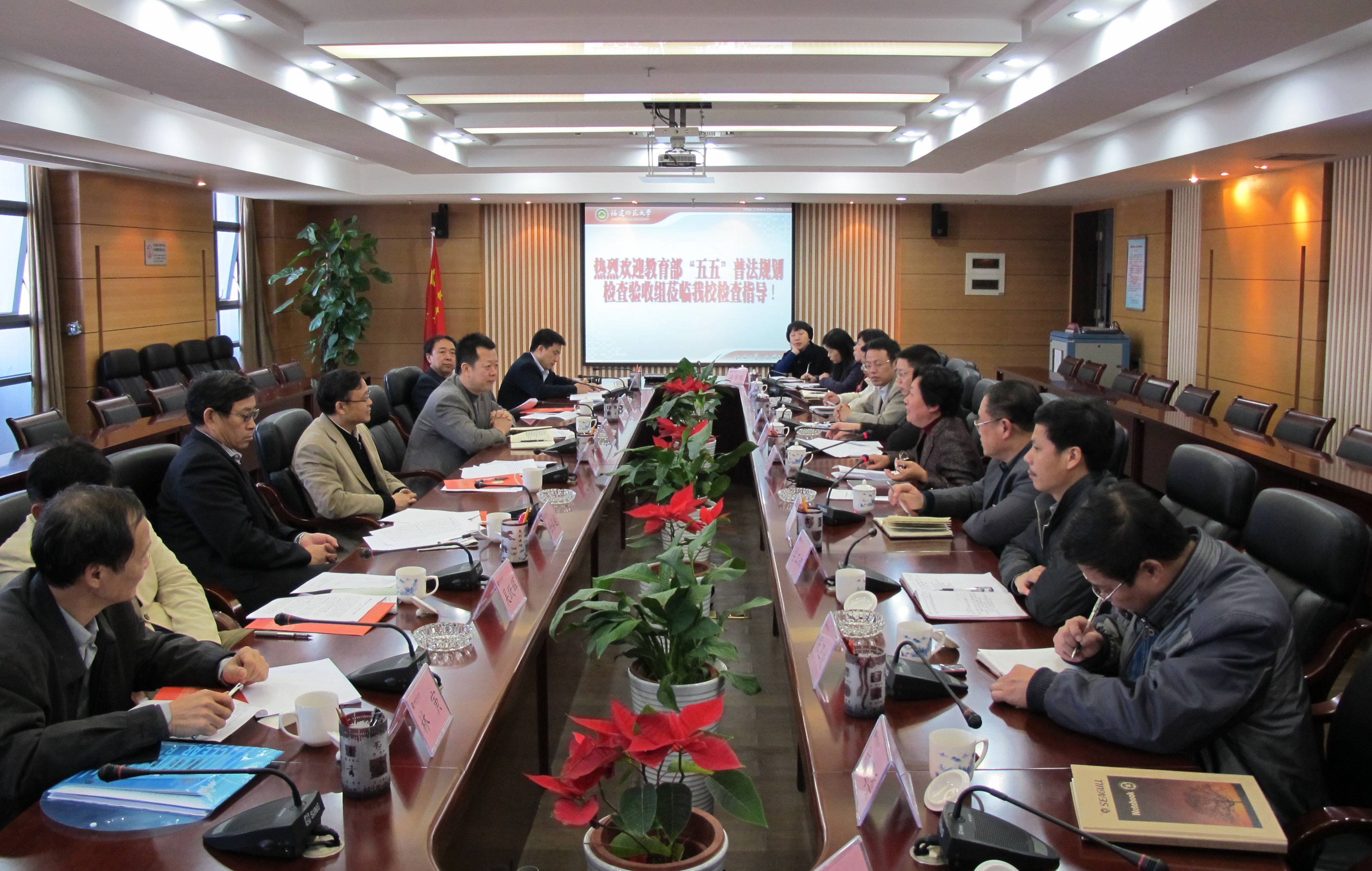 12月9日上午,以教育部法制办公室(全国教育系统普法领导小组办公室)副主任王家勤为组长的“五五”普法检查验收组一行5人,莅临我校检查指导工作。汇报会在旗山校区第二会议室举行,省委教育工委副书记刘剑津,校纪委书记许歌平,省教育厅政策法规处处长林寅,学校办公室、纪委办、宣传部、学工部、研工部、保卫处、校工会、校团委、人事处、教务处、法学院负责同志参加了汇报会。