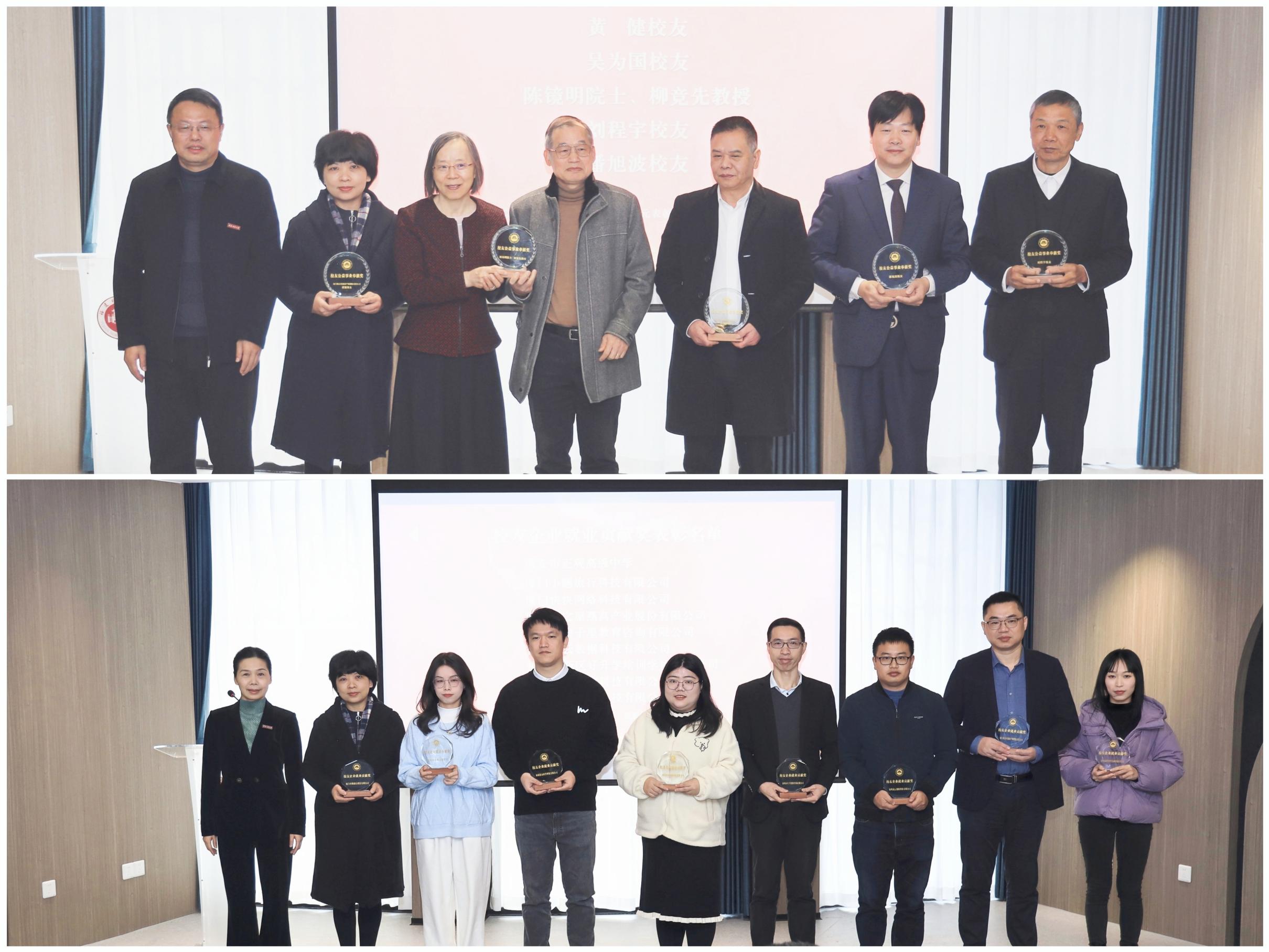在启动仪式上,潘玉腾、陈晓红分别为校友会第三届理事会换届以来获得“校友公益事业奉献奖”和“校友企业就业贡献奖”的个人和集体颁奖。黄健校友、吴为国校友、陈镜明教授、柳竞先教授伉俪、刘程宇校友、潘旭波校友获得“校友公益事业奉献奖”,南安市正观高级中学、厦门小题旅行科技有限公司、厦门快快网络科技有限公司、厦门燕之屋燕窝产业股份有限公司、福州市中子星教育咨询有限公司、福州凌云数据科技有限公司、福州高新区好升学培训学校有限公司、福建启航教育科技有限公司、福建佰孟医学科技有限公司9家校友企业获得“校友企业就业贡献奖”。