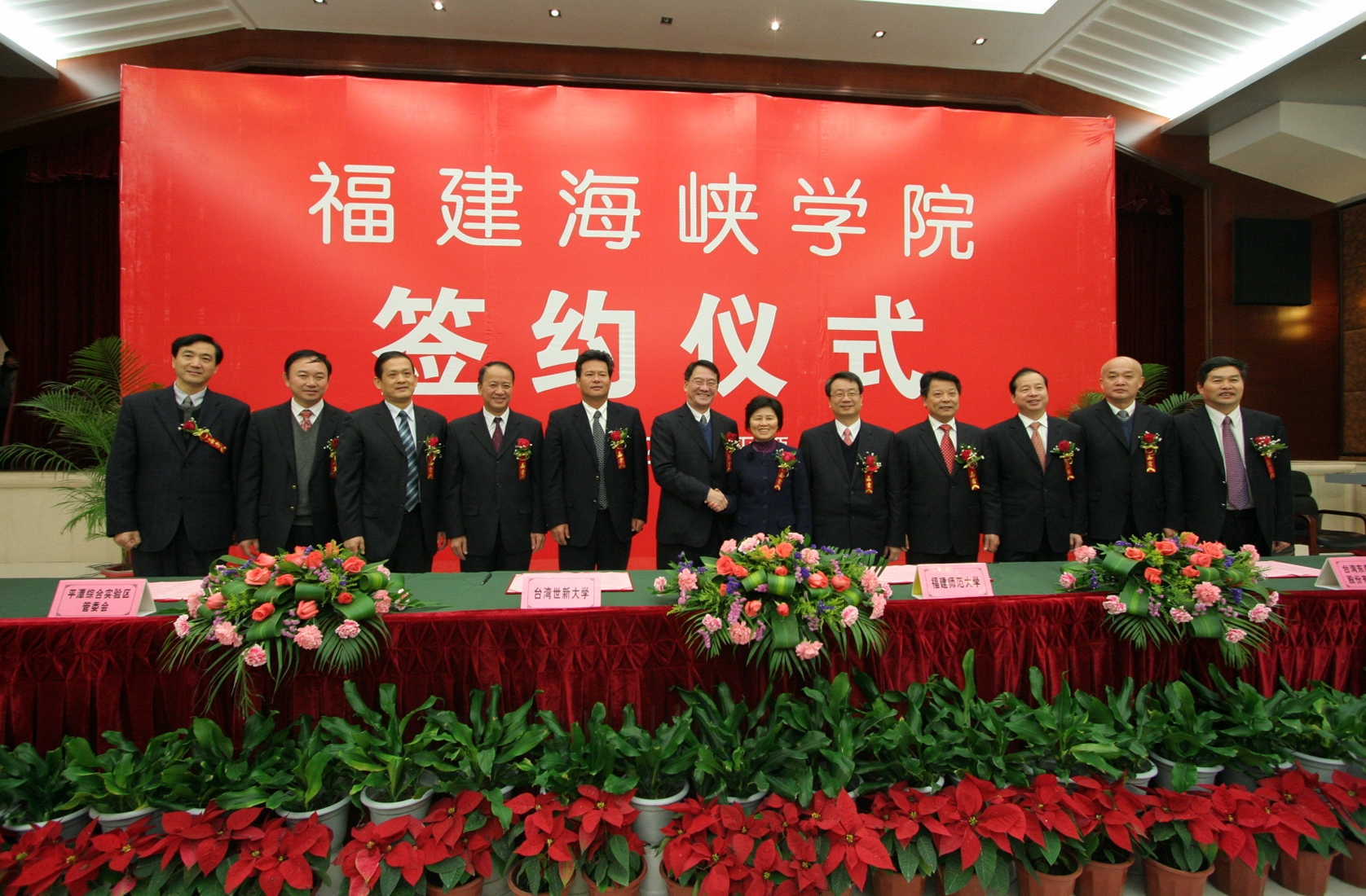 杨辉代表省教育厅向签约仪式的举行表示热烈祝贺,表示将认真贯彻落实省委省政府的战略部署,一如既往地从政策、资金以及保障措施等方面给予全方位支持,促进福建海峡学院又好又快发展。杜源生对福建海峡学院落户平潭表示热烈祝贺,指出四方签约共同创办福建海峡学院,标志着平潭综合实验区教育事业将实现历史性突破,对实验区实现持续发展、科学发展、跨越发展具有特别重要的意义,也将开启两岸在平潭合作办学和文化交流的先河。平潭综合实验区将为创办福建海峡学院提供更加优惠的政策、更加宽松的办学环境和更加优质的服务。 随后,我校党委书记罗萤、台湾世新大学副校长熊杰、台湾东森国际股份有限公司总经理廖尚文、平潭综合实验区党工委副书记、管委会副主任杜源生分别代表合作四方在《共同创办福建海峡学院合作意向书》上签字。 根据合作意向书,我校与台湾世新大学、台湾东森国际股份有限公司、平潭综合实验区管委会将集中和整合各方优质资源,着力先行先试,共同构建海峡两岸合作办学的新机制、新模式,把福建海峡学院建设成为两岸合作办学实验基地、旅游(观光)、传媒、文化创意等领域人才培养基地和产业技术研发创新基地。学院将纳入平潭综合实验区平洋组团统筹规划布局,由实验区提供办学用地800亩;台湾东森国际股份有限公司以募集或其他适当且合于两岸现行法律之方式参与兴建学院的基本建设。学院的功能定位为,以学历教育为主(本科教育和研究生教育),适当兼顾中高等职业教育和职业技术培训、产业研发等。在学科专业设置上,将先以旅游、新闻、传播相关专业为主,再逐步扩大到文化创意类、现代服务业类等专业,在校生总数暂定为1万人。学院招收的学生,由我校与台湾世新大学共同制定人才培养方案和教学计划,共同开发课程和教材,两校教师共同联合培养。 福建海峡学院已于2010年开始招生,目前依托我校旗山校区进行办学,争取2012年9月入驻平潭综合实验区。 (学校办公室 张 苏)
