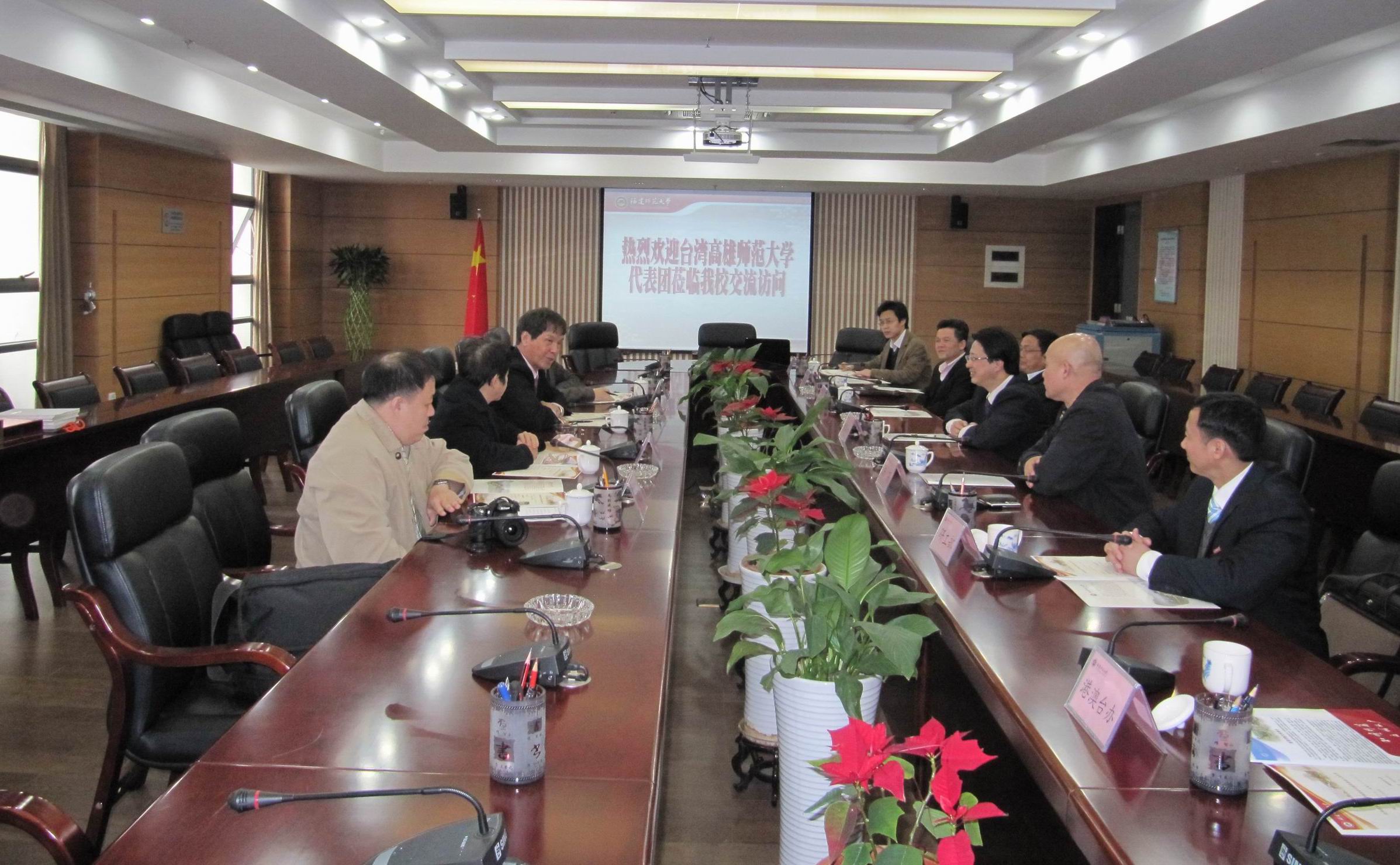 罗萤代表学校对来访客人表示热烈欢迎,双方畅叙了两校多年来的深厚友情。黄汉升回顾了去年访台时与戴校长等台湾教育界同仁的交流场景,许明也表示去年我校对台合作交流取得丰硕成果,与两校的共同努力是分不开的。