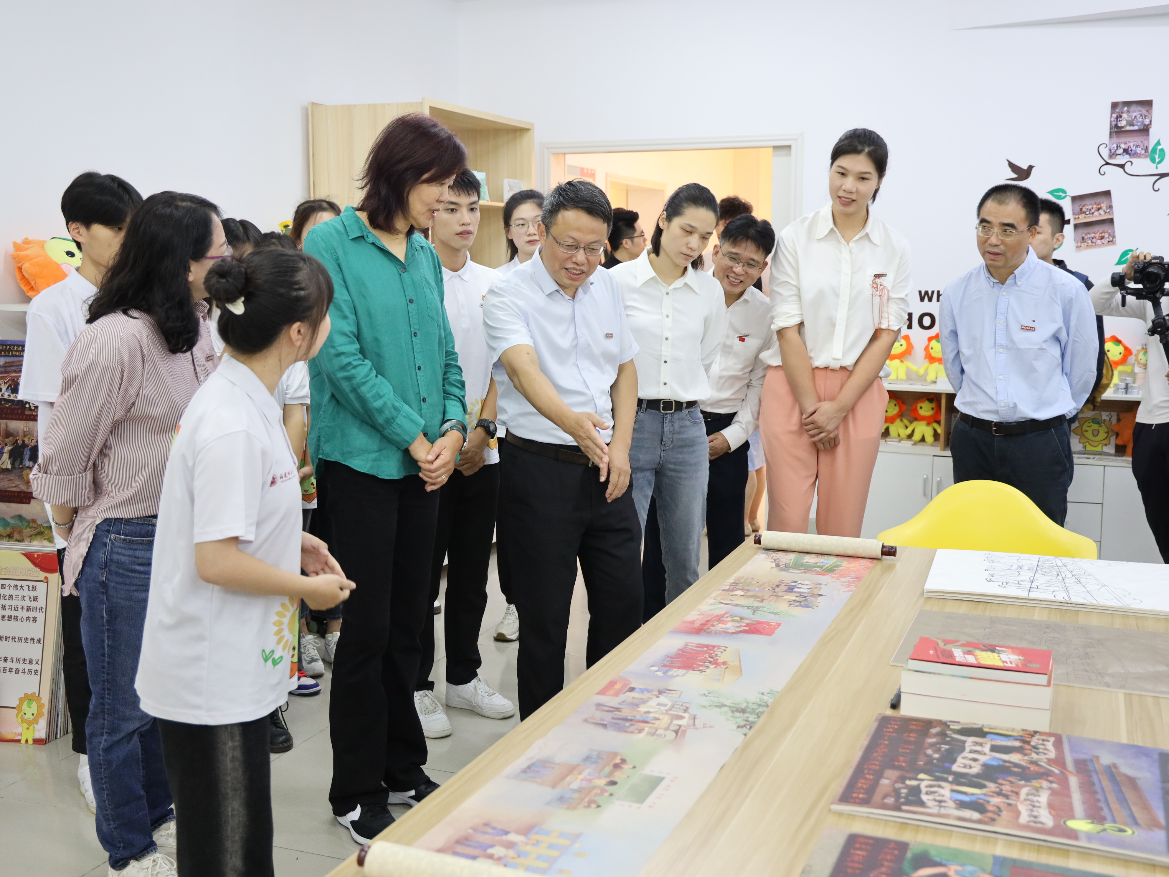 在小葵馆,郎平参观了“小葵”系列文创产品展示,观看了“小葵直播间”球类运动学生社团节目录制实况,察看了融媒体互动长卷《历史上的青年之声》中“中国女排首夺奥运冠军”画面绘制底稿和成品展示,并与青年学生亲切交谈。