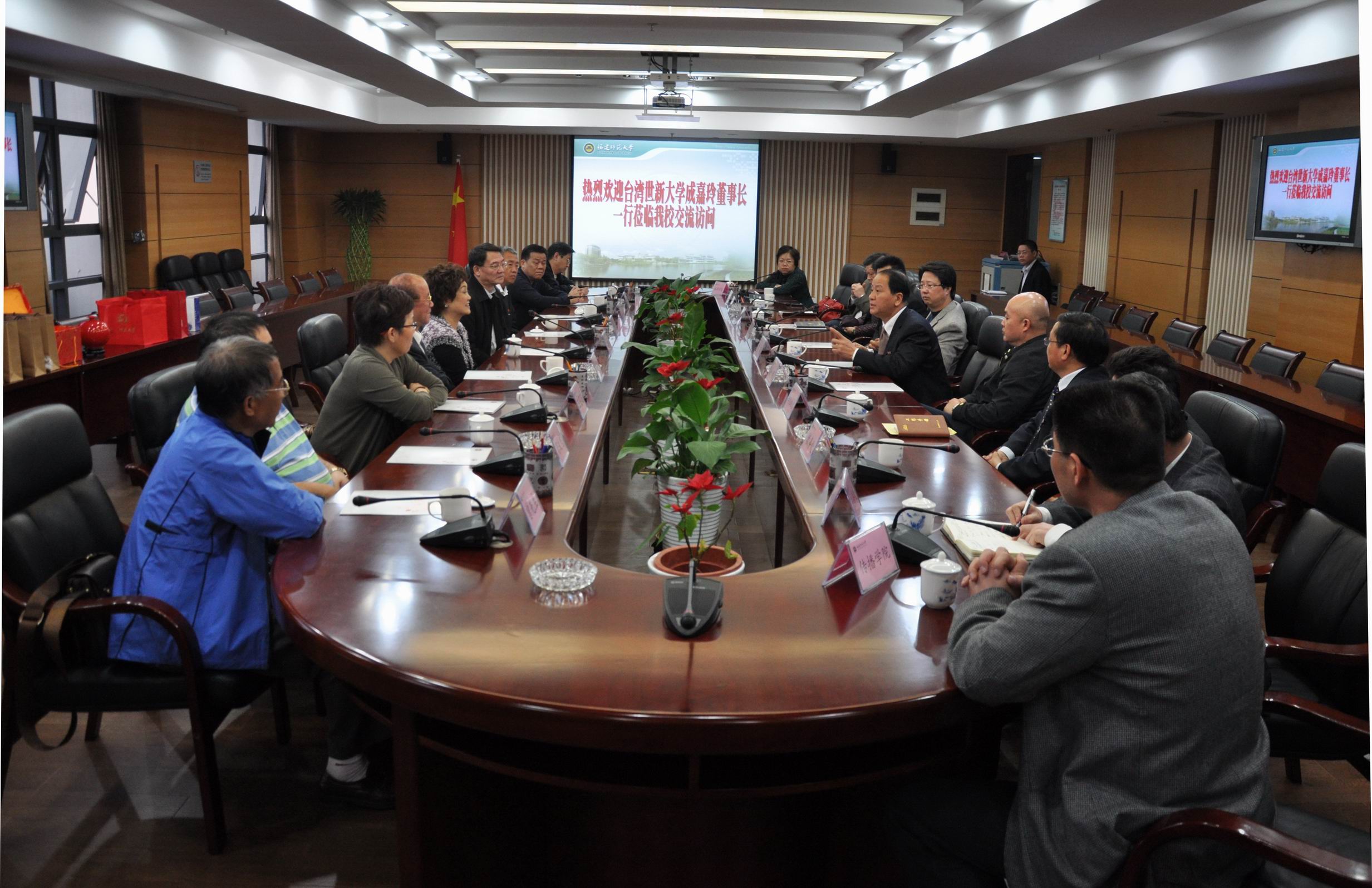 此次是成嘉玲董事长第一次参访我校。罗萤书记代表学校热烈欢迎成嘉玲董事长一行,对世新大学多年来为促进两校交流合作作出的努力表示感谢,并祝愿两校合作迈上新台阶。黄汉升校长简要介绍了我校的基本情况,希望两校在交流合作中能够优势互补,共同发展。许明副校长介绍了我校对台交流合作的概况,希望今后双方不断深化合作,推动两岸教育交流。成嘉玲董事长感谢我校的热情接待,并介绍了世新大学传媒、旅游、管理等优势专业的概况及发展现状。