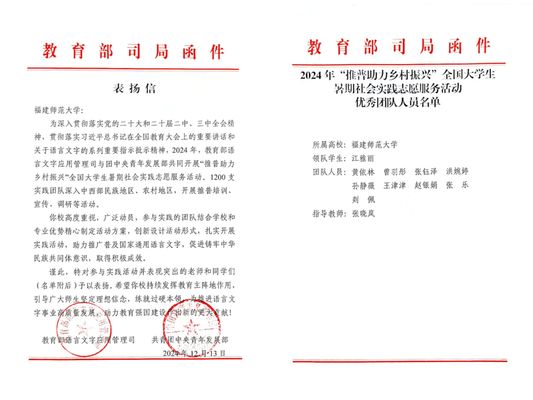 日前,教育部语言文字应用管理司、共青团中央青年发展部向我校发来表扬信,对我校在2024年“推普助力乡村振兴”全国大学生暑期社会实践志愿服务活动中的突出表现予以表扬。表扬信指出,我校高度重视本次“推普助力乡村振兴”全国大学生暑期社会实践志愿服务活动,广泛动员,参与实践的团队结合学校和专业优势精心制定活动方案,创新设计活动形式,扎实开展实践活动,助力推广普及国家通用语言文字,促进铸牢中华民族共同体意识,取得积极成效,并对文学院“跨越山海,闽宁推普”实践队11名师生进行了表扬。(校团委 文学院)