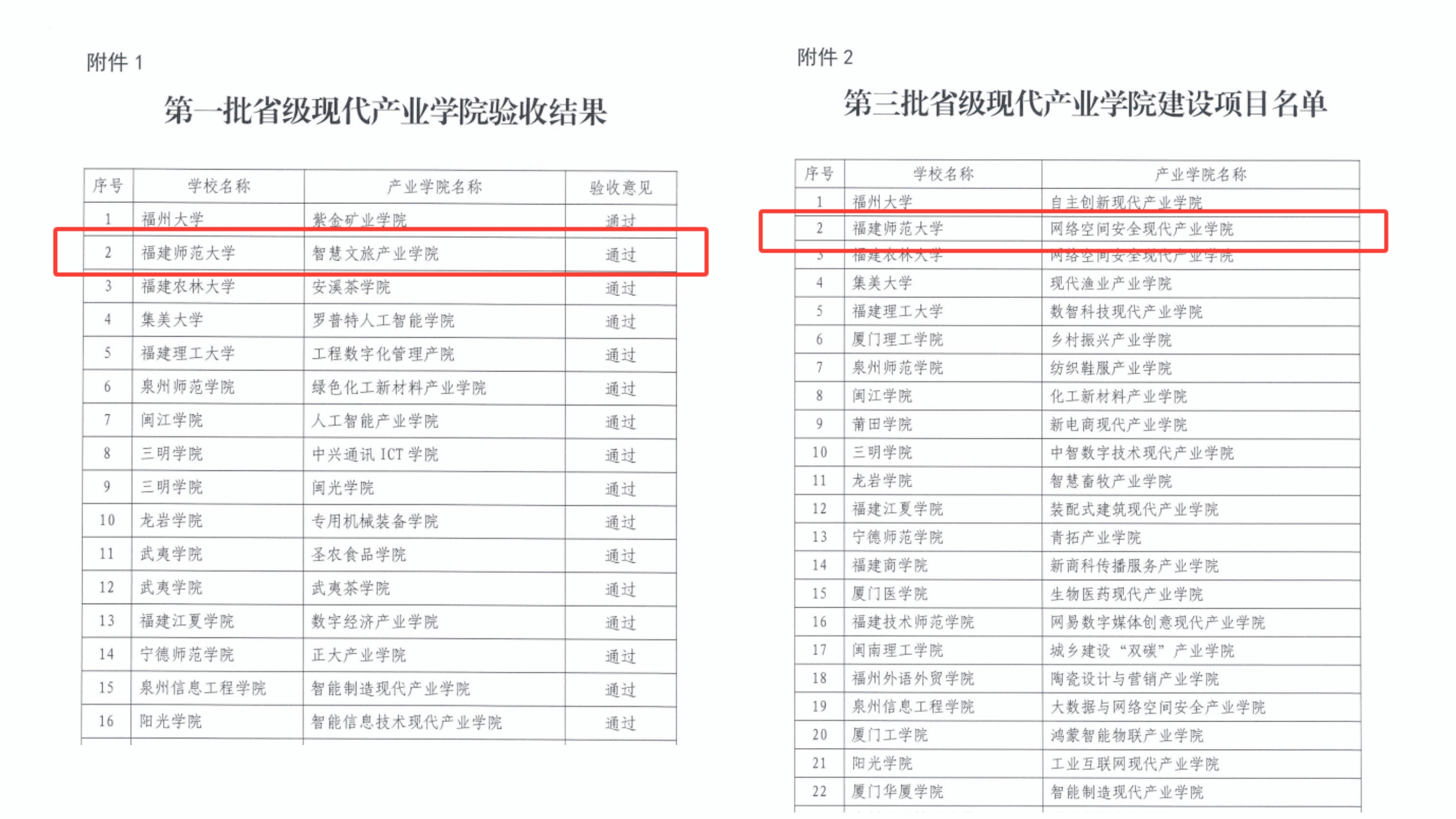 近日,福建省教育厅、福建省工业和信息化厅联合公布省级现代产业学院第一批验收结果和第三批立项建设项目名单。我校智慧文旅产业学院顺利通过第一批省级现代产业学院验收,网络空间安全现代产业学院成功入选第三批省级现代产业学院立项建设项目。截至目前,我校已获批2个省级现代产业学院。