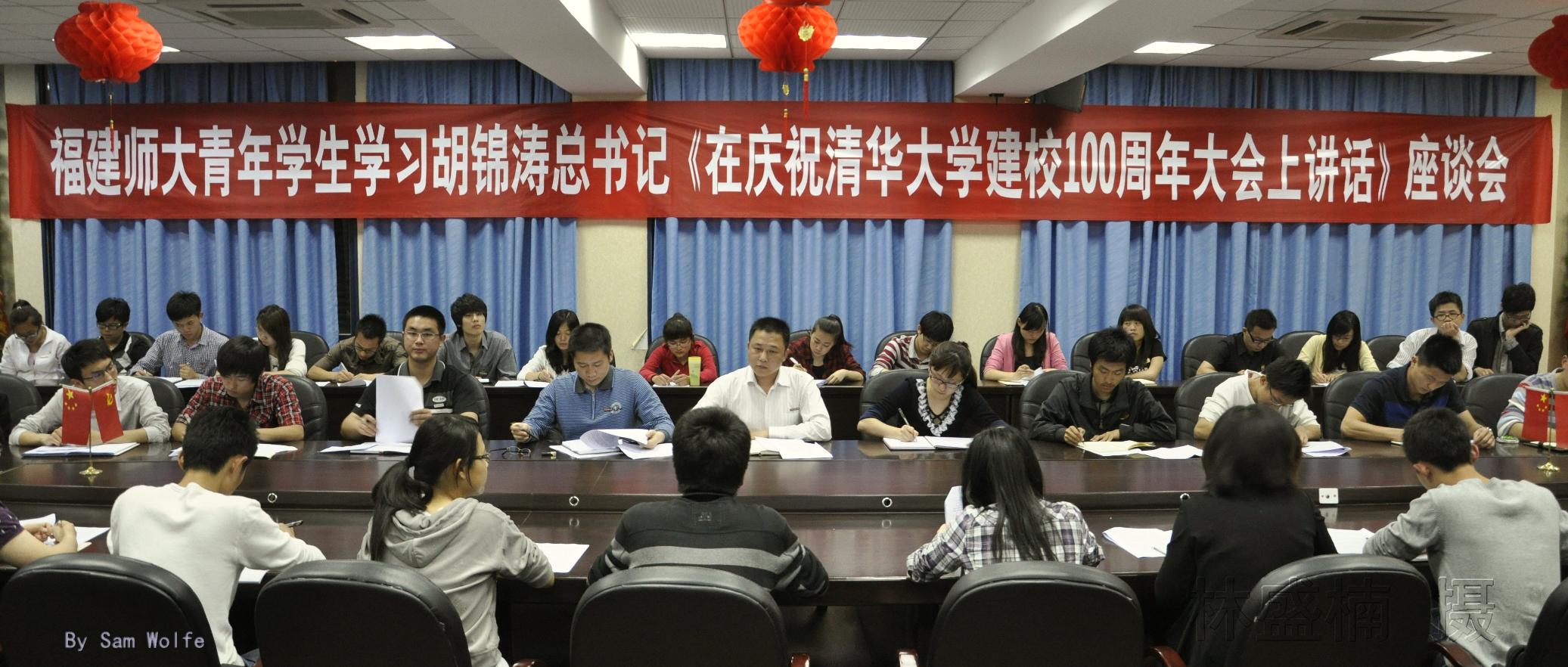 4月25日晚,我校青年学生代表在校大学生素质拓展中心举行座谈会,学习胡锦涛总书记在庆祝清华大学建校100周年大会上的讲话精神。校团委有关同志,校级学生组织负责人,各学院学生会主席、团委副书记代表共50多人畅谈了学习体会。