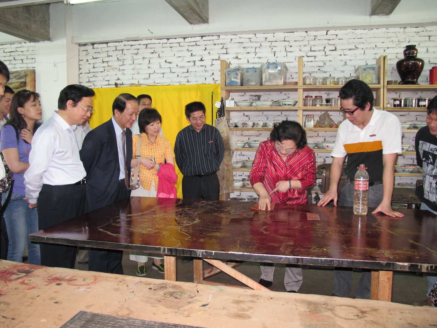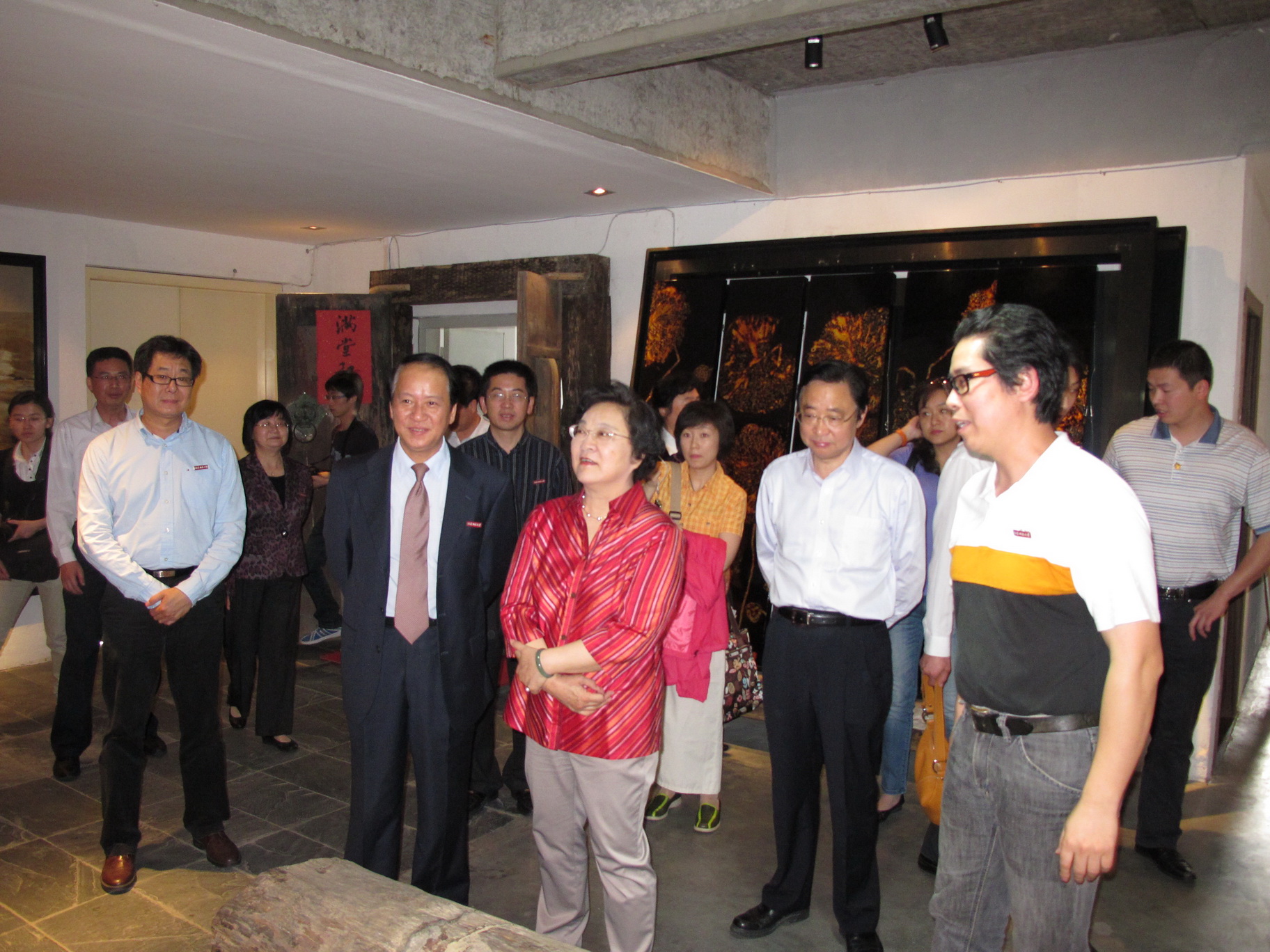 一踏进顶着“大汤坊”牌匾的红漆木门,林副主席便对大家说:“三年前,我在上海看过汤老师的漆画作品展,给我留下了深刻的印象,一直很想到他的工作室看看,今天终于如愿了”。在汤志义老师的引导下,林副主席一边观看漆画作品,一边听取介绍,详细了解漆艺术的历史,感受漆文化的内涵。每到一处,她都驻足端详,仔细询问有关漆画作品创作的手法、传统漆艺与当代绘画的结合等问题,不时与在场的老师们探讨交流。