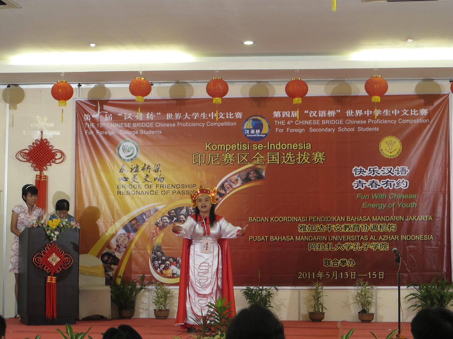 同样与雅加达华文教育协调机构联合举办的第四届“汉语桥”世界中学生中文比赛印尼赛区决赛、第十届“汉语桥”世界大学生中文比赛印尼赛区决赛,先后于5月14日和5月15日在雅加达举行。共有来自全印尼30所中学的38名中学生及25所大学的46名大学生参加了比赛。这是我校在海外创办的孔子学院首次承办国家汉办主办的大型赛事。