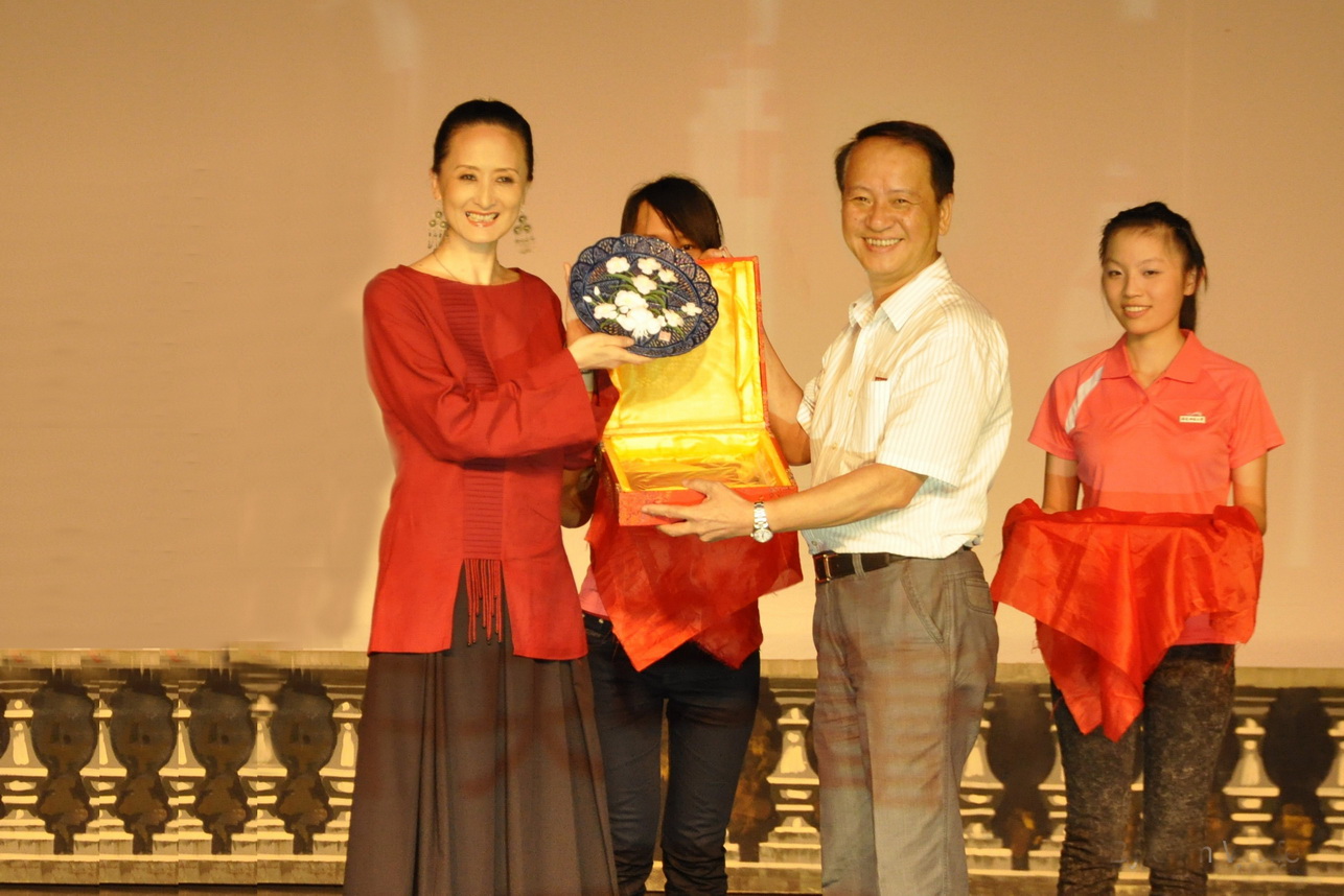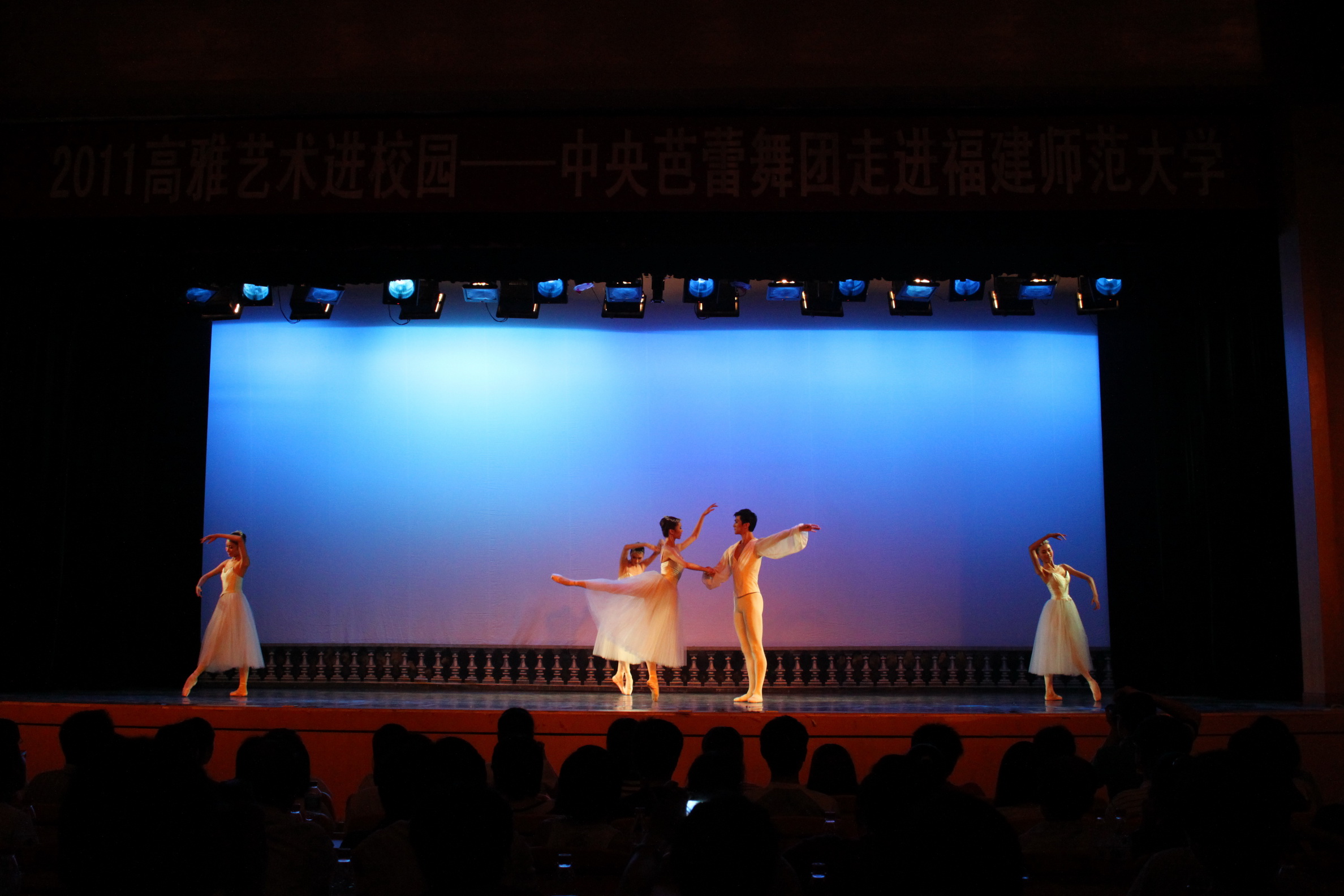 6月6日晚,由教育部、文化部、财政部主办的“2011高雅艺术进校园”之中央芭蕾舞团专场演出在旗山校区青春剧场精彩上演,为我校师生带来了一场集艺术性和教育性于一体的高水准的“足尖盛宴”,让1000多名师生“走近芭蕾”。省文化厅厅长宋闽旺,校党委书记罗萤、纪委书记许歌平观看了演出。罗萤书记还与中央芭蕾舞团团长、艺术总监冯英互赠礼物。