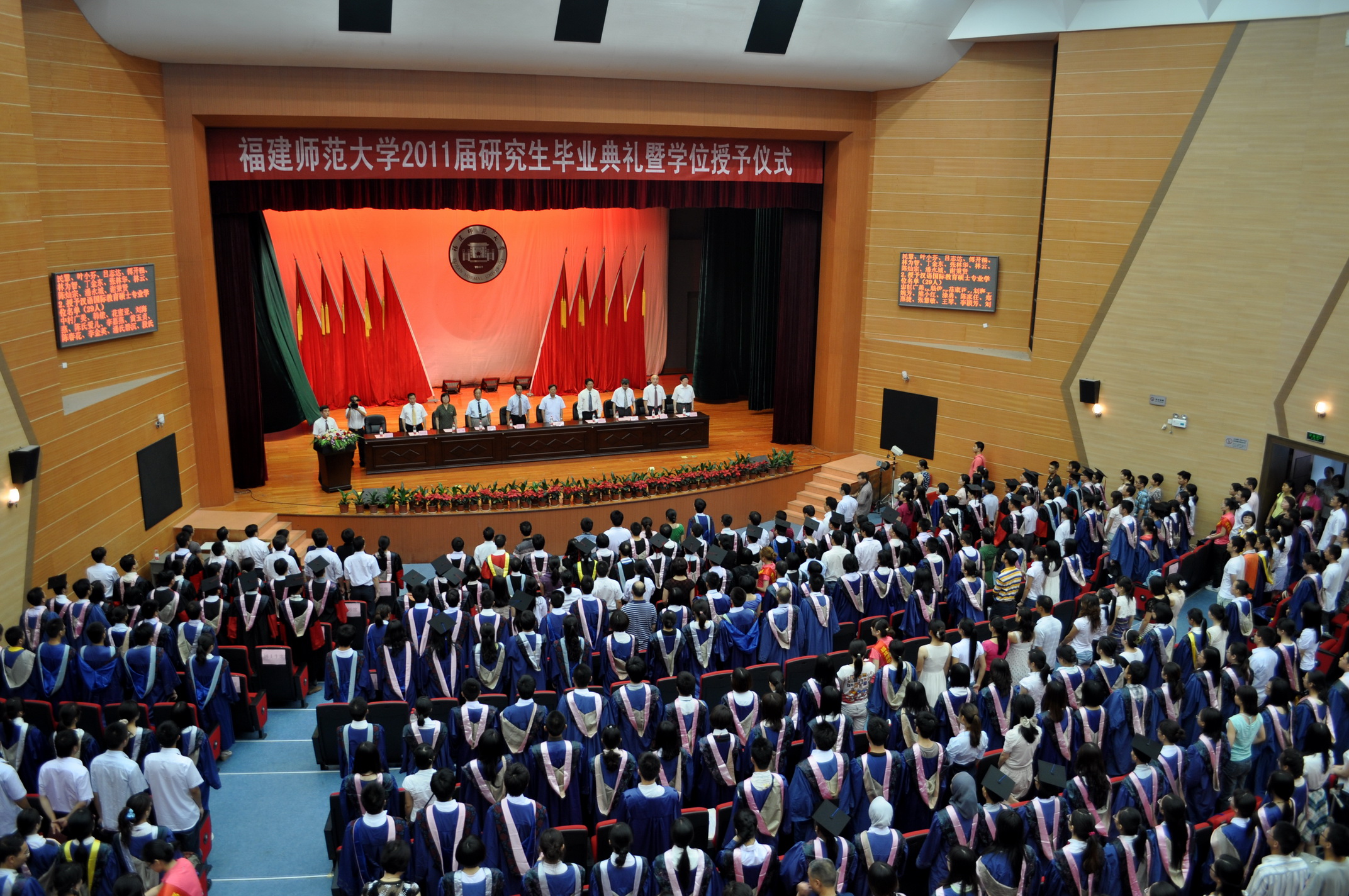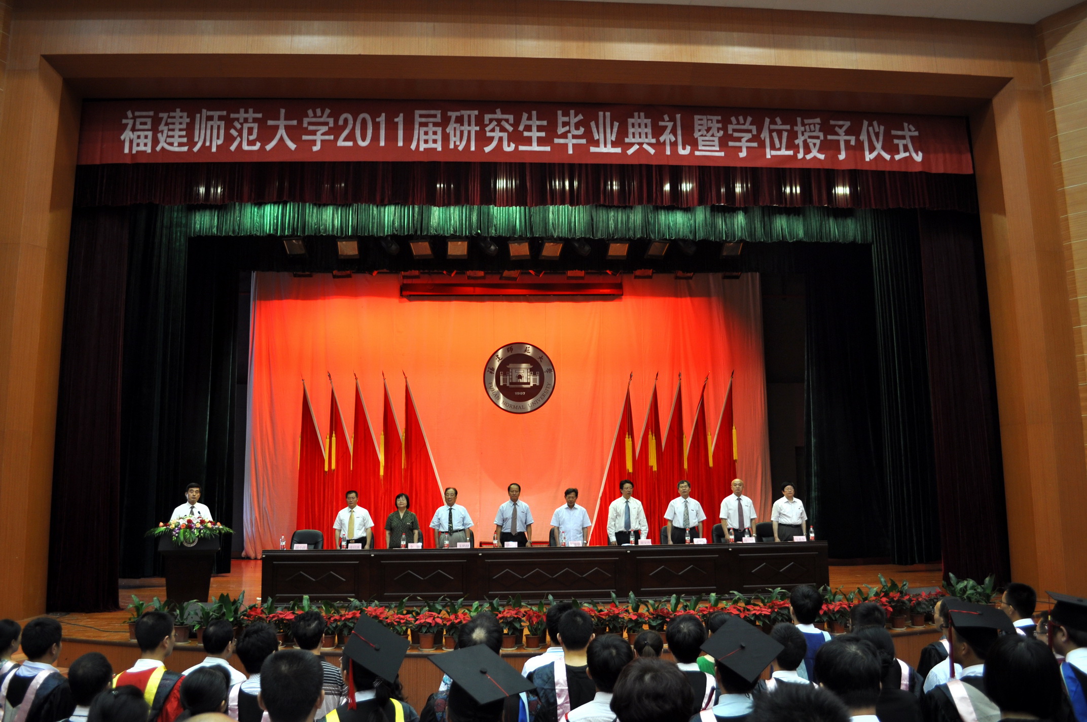 2011届研究生毕业典礼暨学位授予仪式于6月26日上午在旗山校区大会堂隆重举行。省第九届政协副主席王耀华,校领导罗萤、黄汉升、游小波、汪文顶、李敏、许明、凌启淡,原校长朱鹤健,各学院党政分管领导、研究生辅导员、研究生秘书,本届研究生全体指导教师、全体2011届研究生和部分毕业研究生亲友共1200多人参加了典礼。典礼由校党委副书记游小波主持。