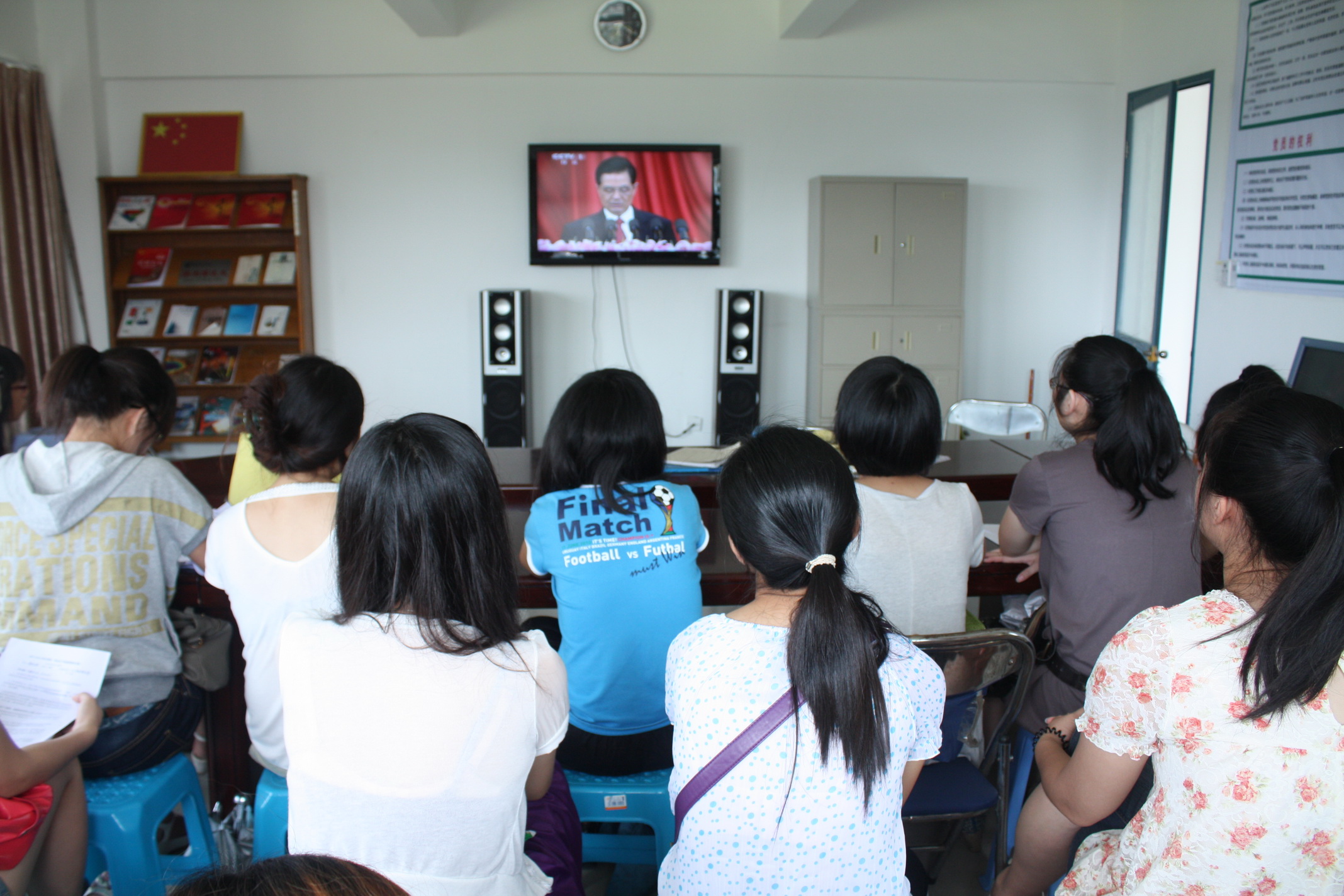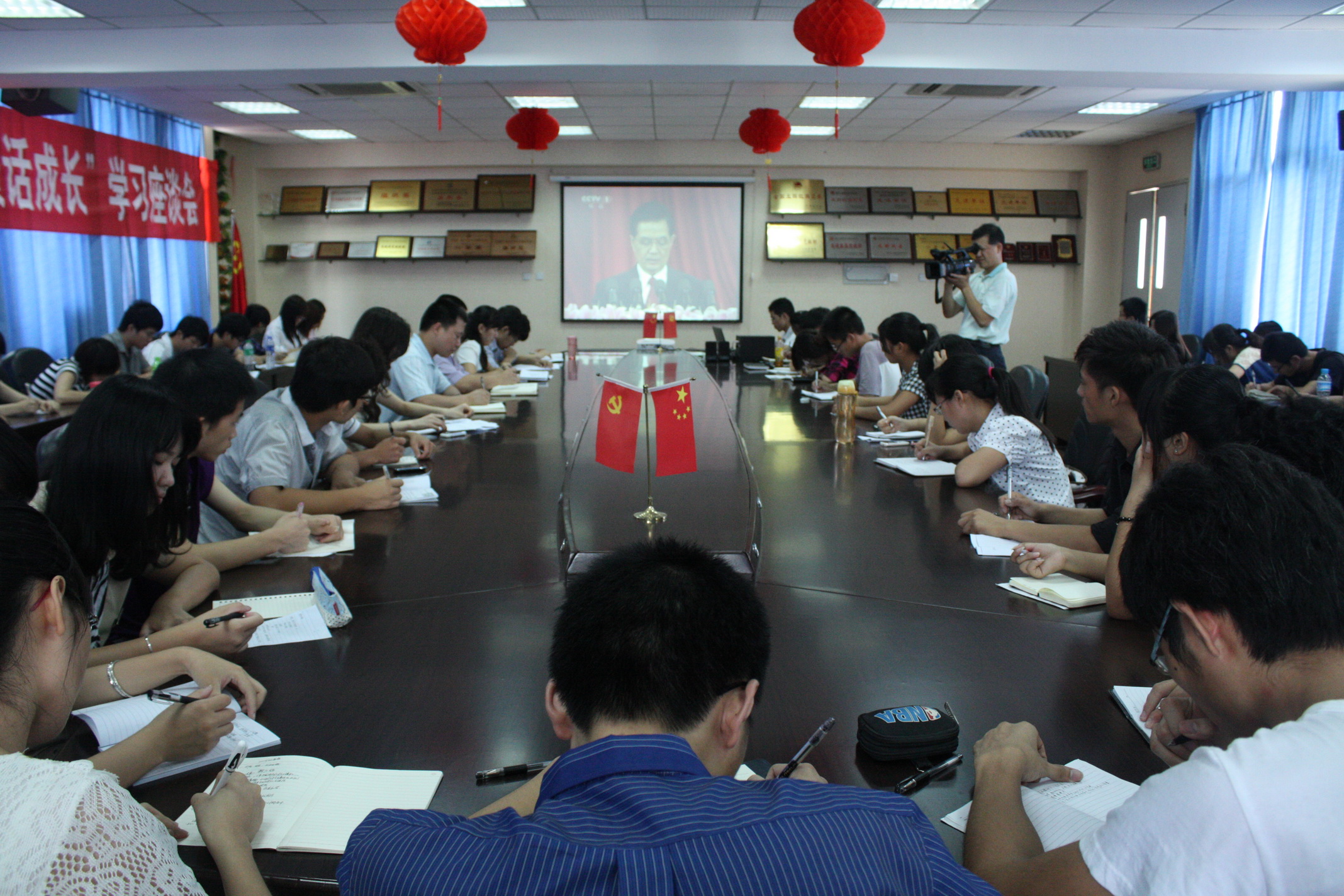 7月1日上午,我校青年学生在会议室、党团活动室、教室、宿舍, 通过电视、网络、广播等各种媒体,收听收看中共中央庆祝中国共产党成立90周年大会,认真学习胡锦涛总书记七一重要讲话精神。