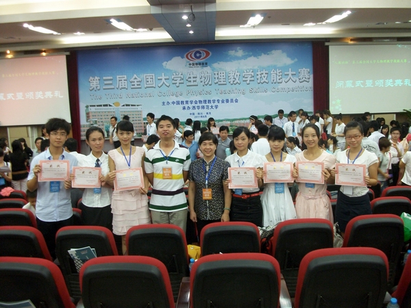 本次大赛包括北京师范大学、华东师范大学等91所全国高师院校共选派800多名师范生参加。我校由物理与光电信息科技学院黄树清、林钦两位老师为领队、6名本科生和1名研究生(本届比赛首开研究生参赛,独立设2个小组)共同组成的代表队参加了此次比赛。7名选手不负众望,在各自的小组中发挥出色,以精彩的讲课和富有创意的教具得到了评委的高度评价,最终全部获得一等奖。其中3名选手(研究生组潘丽珍、本科生组张晴晴、林梦婷)排名小组第一获得特等奖,其他4名选手(本科生组戴颖、卢倩、庄莹莹、章逸文)均名列小组第二获得一等奖。本次比赛的指导教师章镇、黄树清老师获得“优秀指导教师”称号。同时,我校再次获得大赛组委会授予的“优秀组织奖”荣誉称号。