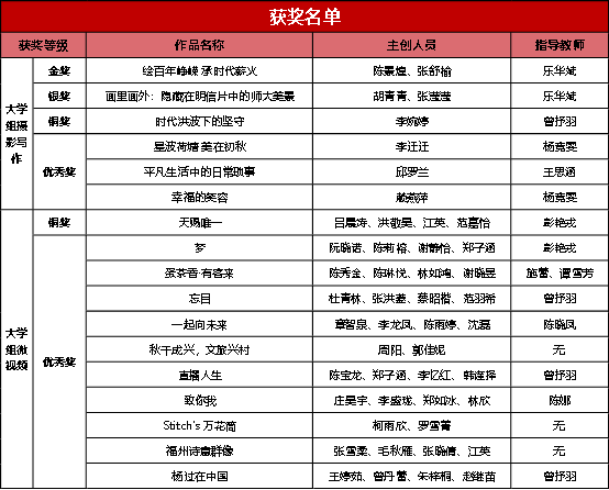 近日,由省委教育工委、省教育厅主办的第六届福建省校园微拍大赛获奖名单公布。我校共有17件作品获奖,其中,大学组摄影写作组金奖1项、银奖1项、铜奖1项、优秀奖3项,大学组微视频组铜奖1项、优秀奖10项,乐华斌老师获优秀指导教师奖,获奖总数居全省高校前列。