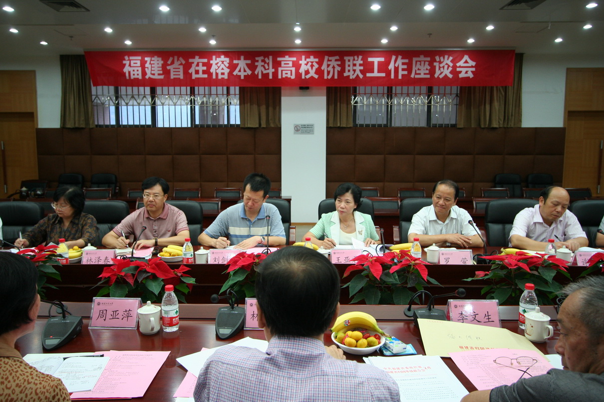 10月11日下午,由省委教育工委、省归国华侨联合会联合主办的福建省在榕本科高校侨联工作座谈会在我校召开。省侨联党组书记、主席王亚君,省委教育工委副书记刘剑津,省侨联副主席兼秘书长林泽春,省侨联副主席谢小建,省侨联副巡视员、组织人事部部长杨石,福州市侨联党组书记、主席蓝桂兰,闽侯县委常委、统战部部长陈长泽,闽侯县侨联主席林钦,校领导罗萤、李敏,省委教育工委和省侨联有关部门负责人,在榕本科高校党委统战部长和侨联负责人参加了座谈会。座谈会由省委教育工委统战部部长詹松青主持。
