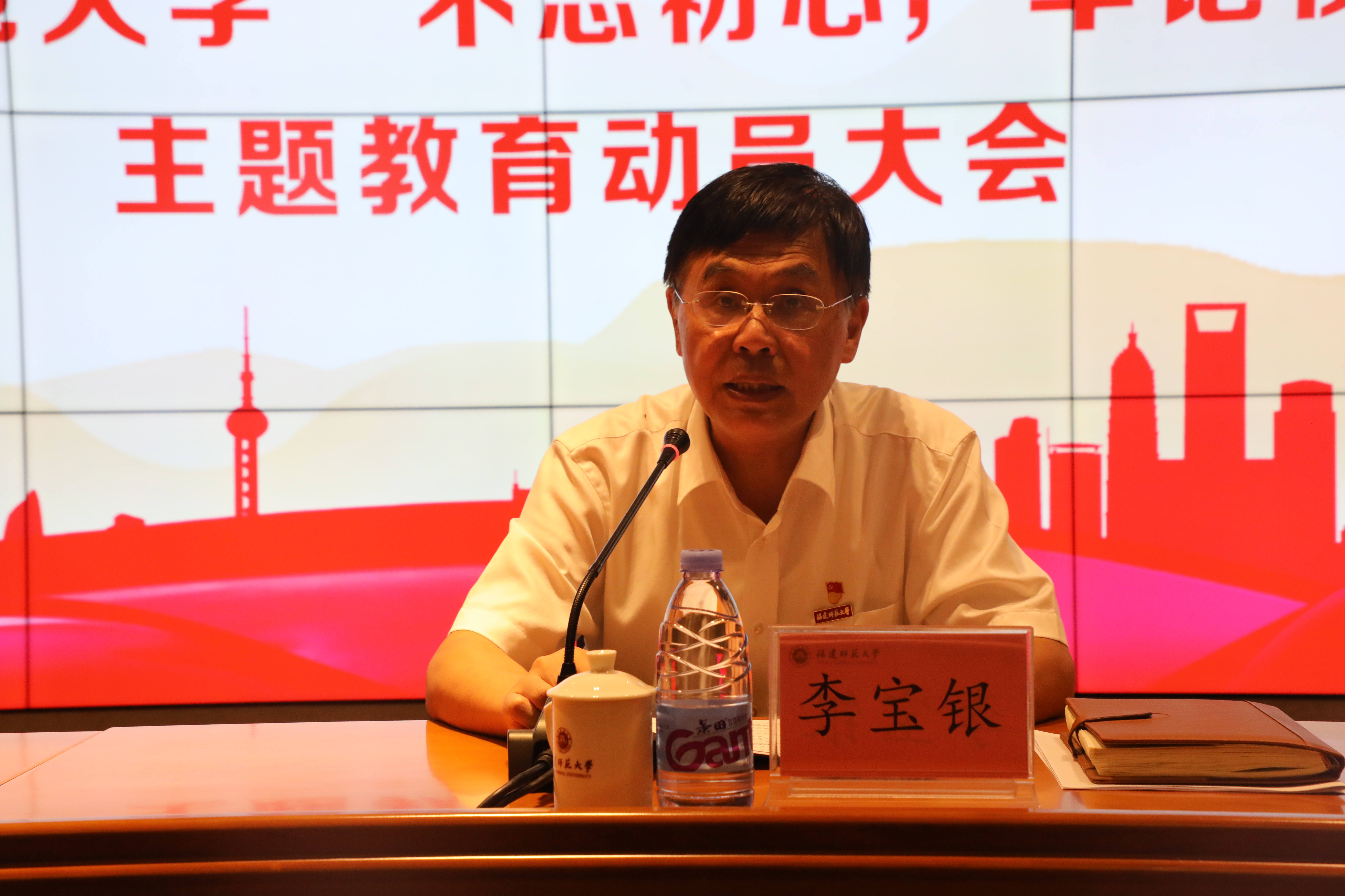 校党委书记李宝银作动员讲话,对开展主题教育进行部署。一要提高政治站位,把握总体要求,以强烈的政治责任感和历史使命感抓好主题教育。要坚持以习近平新时代中国特色社会主义思想为指导,深入贯彻落实中央、全省“不忘初心、牢记使命”主题教育第一批总结暨第二批部署会议的精神,不断增强抓好主题教育的政治自觉思想自觉行动自觉。二要聚焦目标要求,落实重点举措,高标准高质量推进主题教育各项工作。要把学习教育、调查研究、检视问题、整改落实四个“贯穿始终”的重点措施贯通起来、衔接起来,结合学校实际创造性地开展工作。三要加强组织领导,抓好统筹协调,为开展好主题教育提供坚强组织保障。要坚持以上率下,强化责任担当;坚持求真务实,力戒形式主义;坚持统筹兼顾,两手抓两促进,激励广大教职工不忘教育初心,牢记育人使命,加快建设特色鲜明的高水平综合性大学,以优异成绩迎接新中国成立70周年。