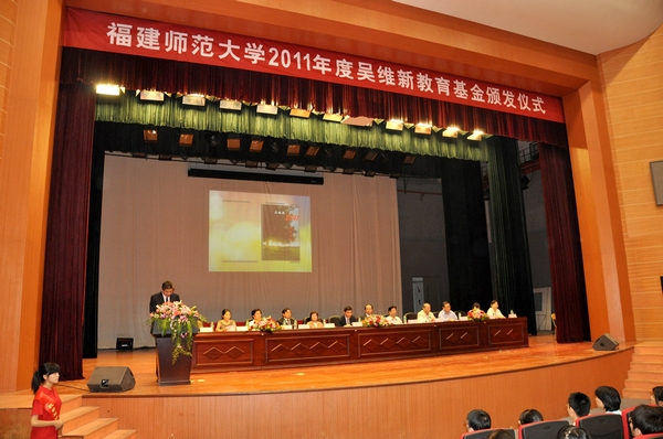 颁发仪式于10月22日下午在旗山校区大会堂举行。我校校友、香港集成汇财(集团)有限公司董事长吴维新,我校香港校友会荣誉会长黄碧云,福建省关心下一代工作委员会副主任郭荣辉,校党委副书记游小波、校关工委主任陈锋,学校办公室、纪委办、学工部、校友总会和数学与计算机科学学院负责人,以及数学系1961级部分校友和获奖学生近500人参加了颁发仪式。
