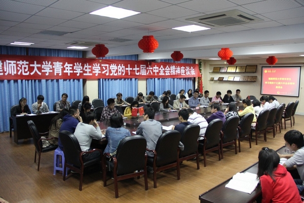 10月25日晚,我校青年学生代表在校团委素质拓展中心举行座谈会,认真学习党的十七届六中全会精神。校团委有关负责人、校团委机关工作人员、校级学生组织和各学院学生代表畅谈了学习体会。