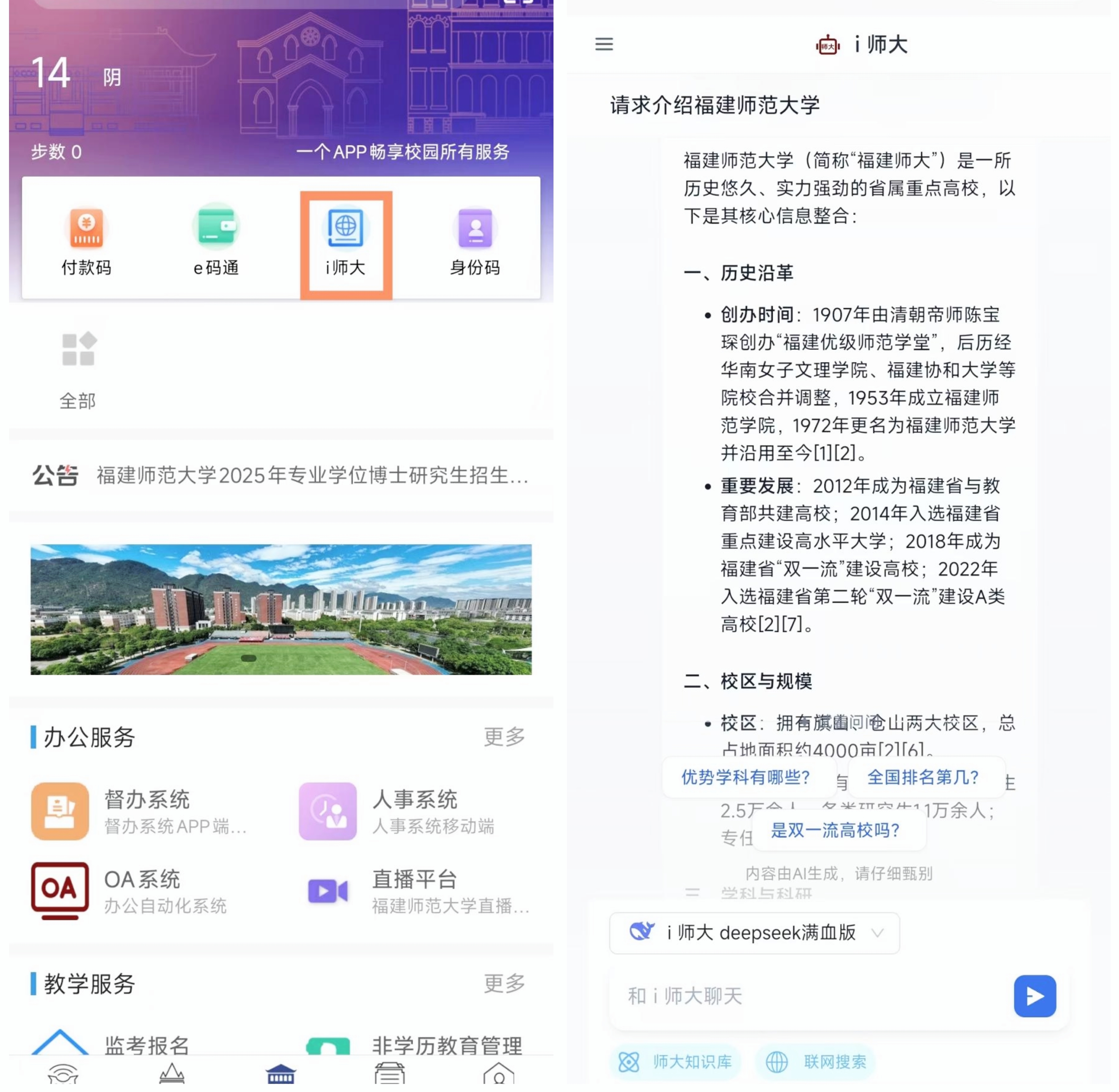 为响应国家教育数字化战略,我校积极探索人工智能技术在星空官网app下载入口中的创新应用。未来,学校将以“i师大”智能服务平台为载体,进一步优化功能模块、拓展学科定制服务,并探索虚拟助教、智能数据分析等前沿应用场景,持续推动人工智能与星空官网app下载入口的深度融合。