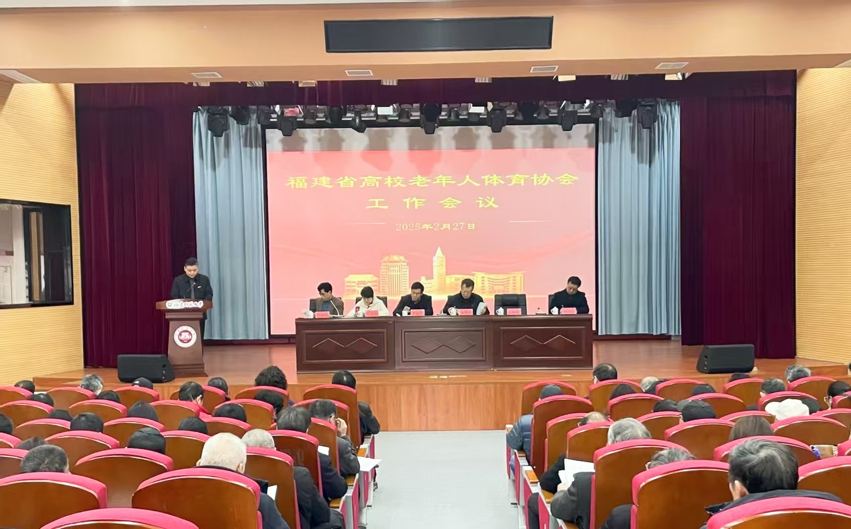 会议于2月27日至28日在仓山校区科学会堂召开。省政协教科文卫体委副主任、省高校老年人体育协会主席刘剑津,省教育厅二级巡视员李建华,我校副校长吴剑锋,省高校老年人体育协会副主席朱琦环,以及来自全省46所高校的离退休工作部门负责人、老体协主席、秘书长共计100余人参加会议。会议由省高校老年人体育协会秘书长骆积强主持。