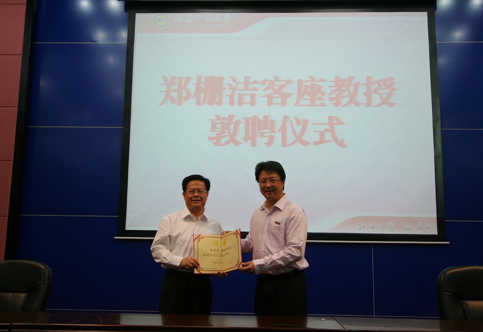 报告会前,举行了敦聘郑栅洁主任为我校客座教授仪式。黄汉升校长为郑栅洁主任颁发聘书,并佩戴校徽。