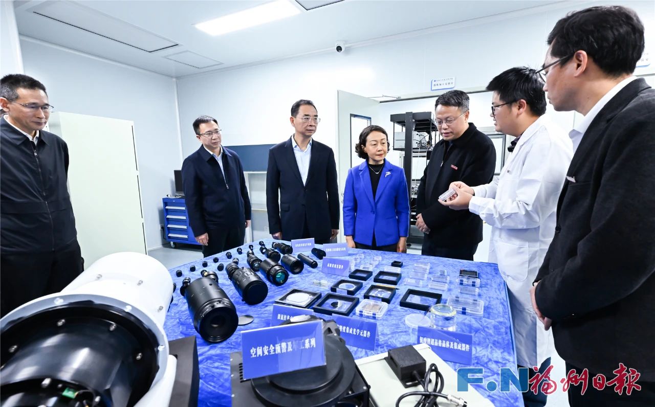 郭宁宁一行实地考察我校福建省光子技术重点实验室,深入了解光学技术研发、转化应用、产业发展等情况,听取了集成光学与激光技术实验室负责人有关光学器件创新工艺流程及服务福州光电科技产业特色发展成果介绍,现场观看了百级光刻、镀膜、刻蚀等实验,以及在极端环境光学系统和集成光学元器件的展示和产品应用。郭宁宁充分肯定了我校依托相关实验室,大力推动科技创新与产业创新融合,服务国家战略需求和地方产业发展所作的贡献,希望持续面向国家战略和重大需求,深化校企合作,加强基础研究和研发攻关,推动技术和产品不断迭代升级,为构建具有福州特色现代化产业体系做出更大贡献。