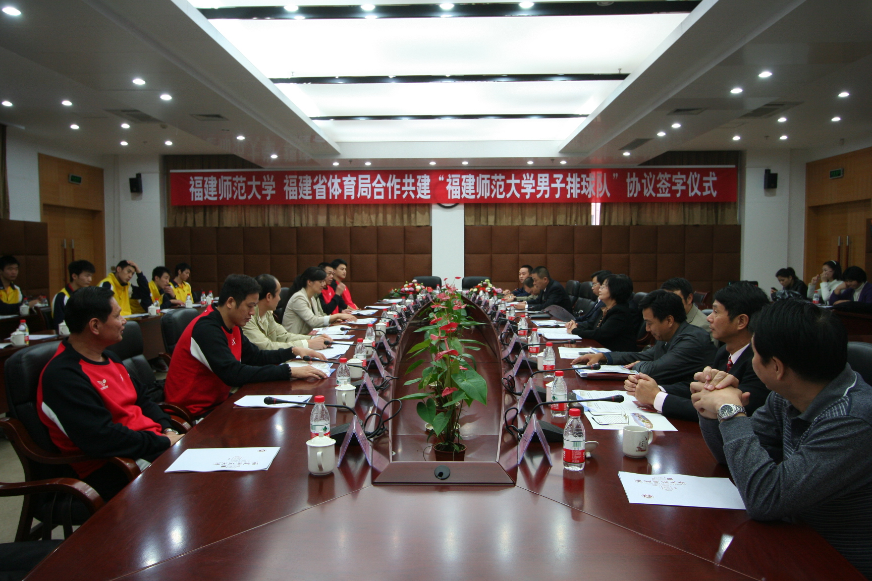 根据协议,双方本着“资源共享、责任共担、义务共尽、成果共用”的原则进行合作。我校将按照有关招生政策规定,逐步将我省排球队符合条件的队员录取为在籍学生,按照在籍在学在训的要求,在保证训练和比赛的前提下,制订个性化培养计划,使高水平运动员顺利完成大学学业。省体育局将“福建省男子排球队”更名为“福建师大男子排球队”,代表福建参加全国男子排球联赛等比赛,我校提供符合要求的主场赛场设施和食宿。