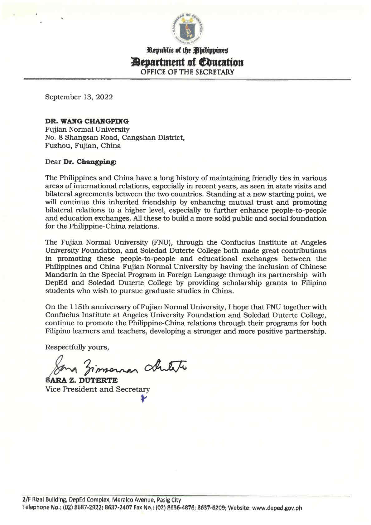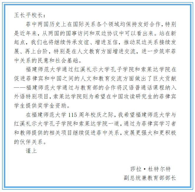 近日,菲律宾副总统兼教育部部长莎拉•杜特尔特为我校115周年校庆发来贺信。贺信原文及翻译如下: