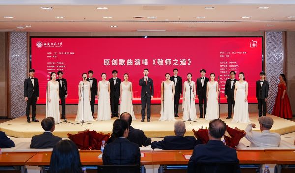 颁授典礼播放了《师道·师说》宣传片和文科资深荣誉教授、文科资深教授事迹短片,宣读了颁授词;校友、师生代表接受主持人现场访谈,分享了与五位教授间的动人故事以及从他们身上感受到的独特人格魅力。王长平逐一为文科资深荣誉教授、文科资深教授颁授证书和奖牌,青年学生为教授们献花,传播学院、音乐学院师生们表演了原创诗朗诵节目《大先生颂》和原创歌曲演唱节目《敬师之道》。五位教授深情回顾了从教生涯、殷切寄语广大师生,他们深厚的家国情怀、严谨的治学态度、渊博的学识见识、求真的科研精神,深深感染了在场师生,现场响起经久不息的热烈掌声。