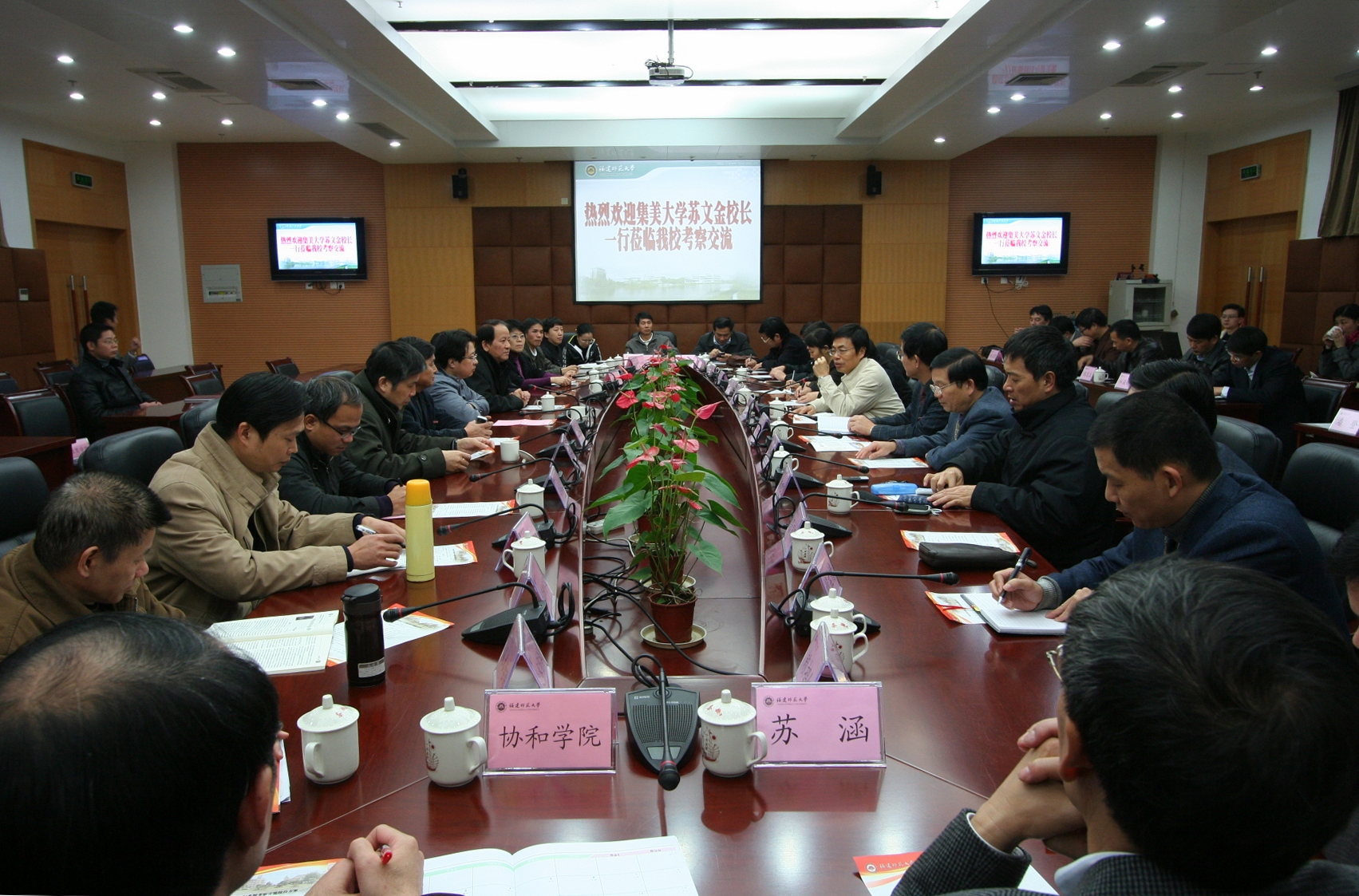 12月20日,集美大学校长苏文金、校长助理叶光煌率领部分机关部门、学院负责人来校考察交流。校领导罗萤、黄汉升、许歌平,我校部分机关部处、学院负责人出席了交流座谈会。